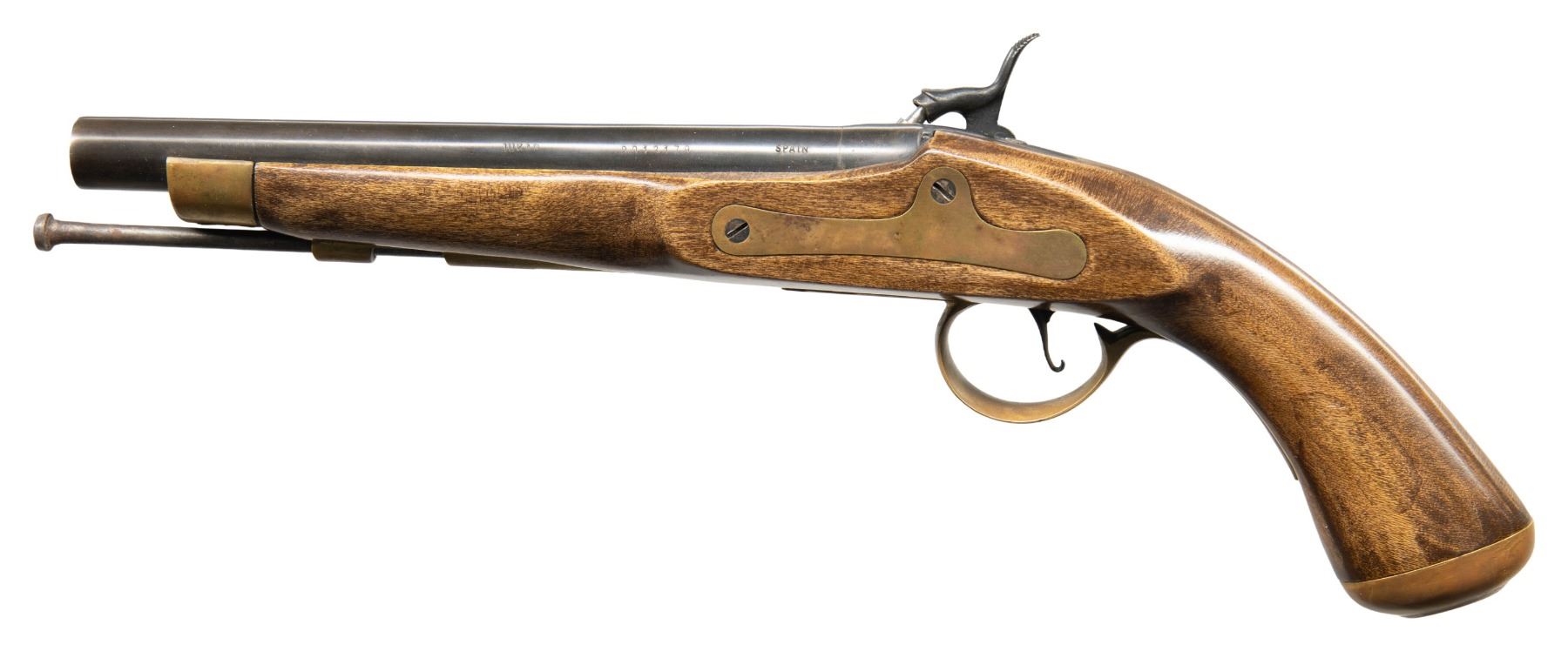 Cal. 45 Rifled. S# 0013179. Bbl. 9". Percussion pistol mfg. in Spain by Jukar. Left side of the rnd. bbl. is marked "JUKAR", followed by the S# and "SPAIN". Lockplate is engraved with bordered scrollwork on a punch dot background. Metal components exhibit a blue finish overall. 1-piece plain wood stock features a brass trigger guard, pommel cap, sideplate, 2-screw nose cap, pipe, and thimble. Complete with steel ramrod. CONDITION: metal components retain the majority of their original factory blue finish, showing some areas of wear fading to a gray brown patina (predominately around muzzle area of bbl.). Bright bore, retaining well defined rifling throughout. Proper manual mechanics. Stock is very good overall, with brass fittings having acquired a mellow patina. (01-28212/MLW). ANTIQUE. $175-250.