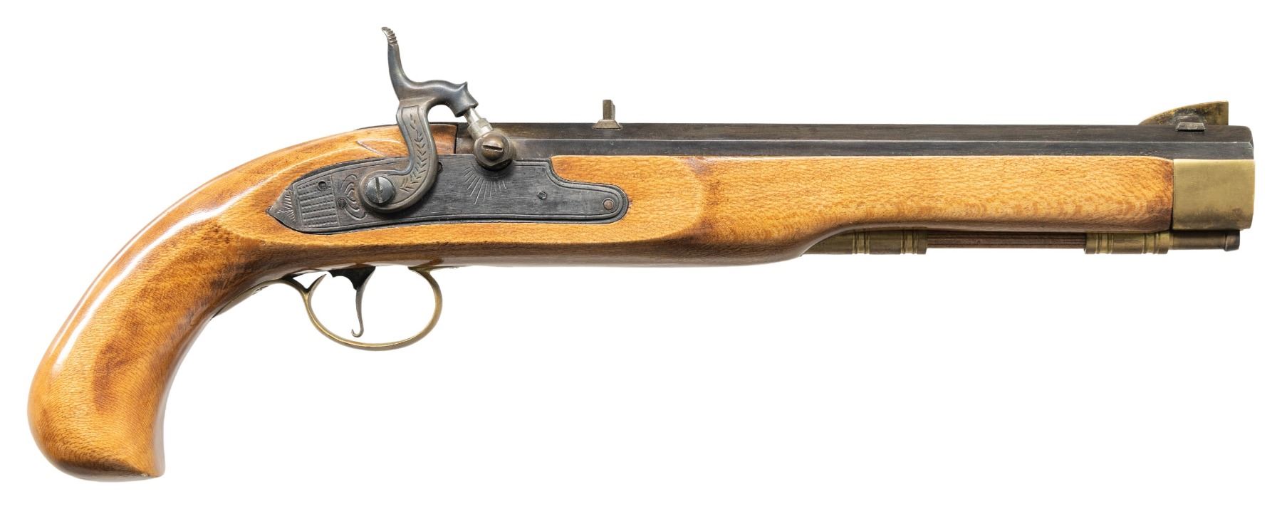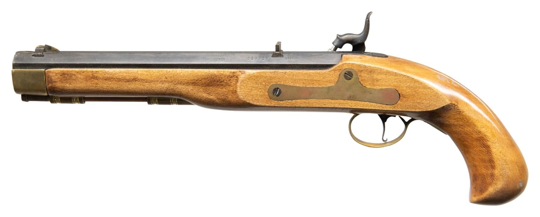 Cal. 45 Rifled. S# 059827. Bbl. 9 13/16". Percussion pistol mfg. in Spain by Jukar. Left side of the octagonal bbl. is marked "BLACK POWDER ONLY/ JUKAR", followed by the S# and "SPAIN". Lockplate, curled trigger, and bbl. exhibit a blue finish, with the hammer exhibiting a case colored finish. 1-piece plain wood stock featuring a brass trigger guard, sideplate, nose cap, pipe, and thimble. Reverse dovetail mounted blade front sight, with dovetailed V-notch rear sight. CONDITION: metal components retain the vast majority of their original factory blue finish, exhibiting some superficial handling marks, with some light thinning and wear on the bbl. Bright bore, retaining well defined rifling throughout. Proper manual mechanics. Stock is very good overall, with brass fittings exhibiting areas of patina. (01-28213/MLW). ANTIQUE. $175-250.