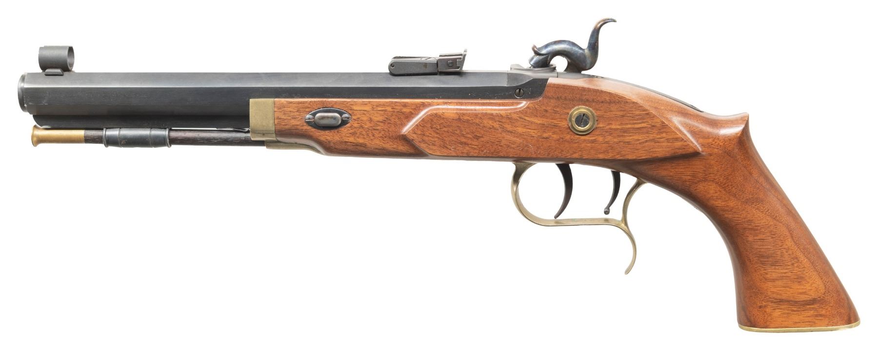 Cal. 45. S# 20519. Bbl. 9". Hooded blade front sight. Adjustable rear sight. Case colored lock assembly. Brass furniture. Double set single action triggers. Blued bbl. Walnut stock. Hardwood ramrod with brass tip. CONDITION: stock shows some light handling marks. Lock retains nearly all its case colors with some light oxidation. Brass parts are turning dull with some scattered oxidation. Bbl. retains nearly all its bluing with some light oxidation specks & minor handling wear. Near excellent bright shiny bore. PROVENANCE: Estate of Groves Herrick. (01-28320/MJC). ANTIQUE. $250-400.