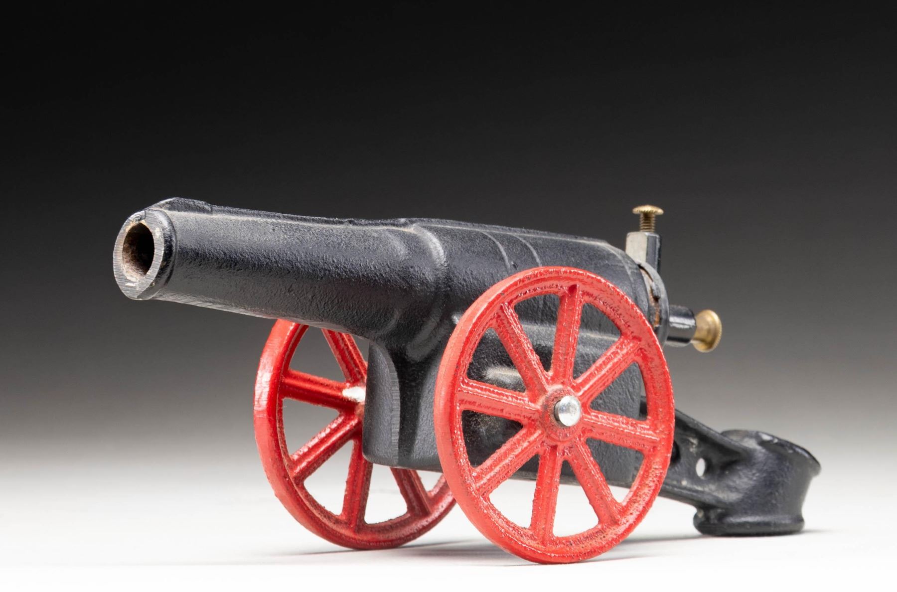 Small flint steel cannon. Cannon is virtually unmarked, save for "PA TD" at the breech area and a "3" stamped on the left side of the trail. Cast iron construction with 2 brass heads at breech. Cannon measures 9" from the muzzle to the end of the trail and approx. 3 3/8" across the ends of the wheels. Black painted exterior, with red painted wheels. Cannon appears to be missing a part/component at the trail. CONDITION: cannon retains the majority of its painted exterior, exhibiting some light wear overall. Brass fittings have acquired a pleasing mellow patina. PROVENANCE: Norman Olliff Estate. (02-25663/MLW). NON-GUN. $25-50.
