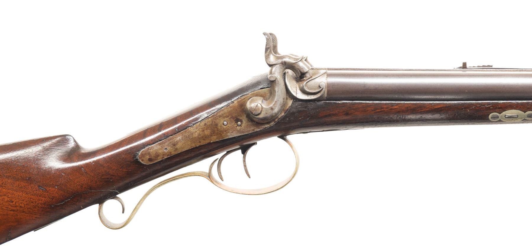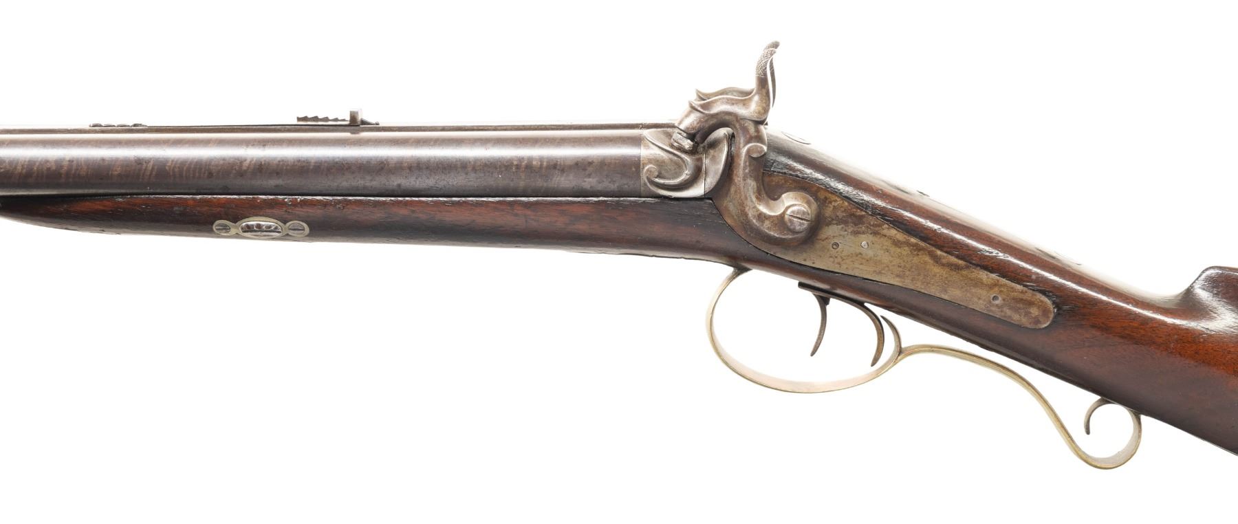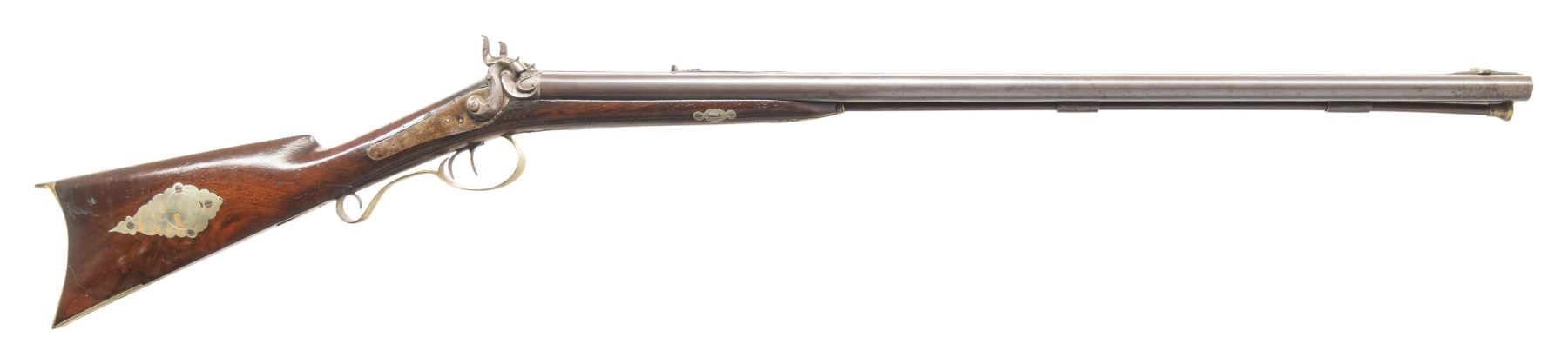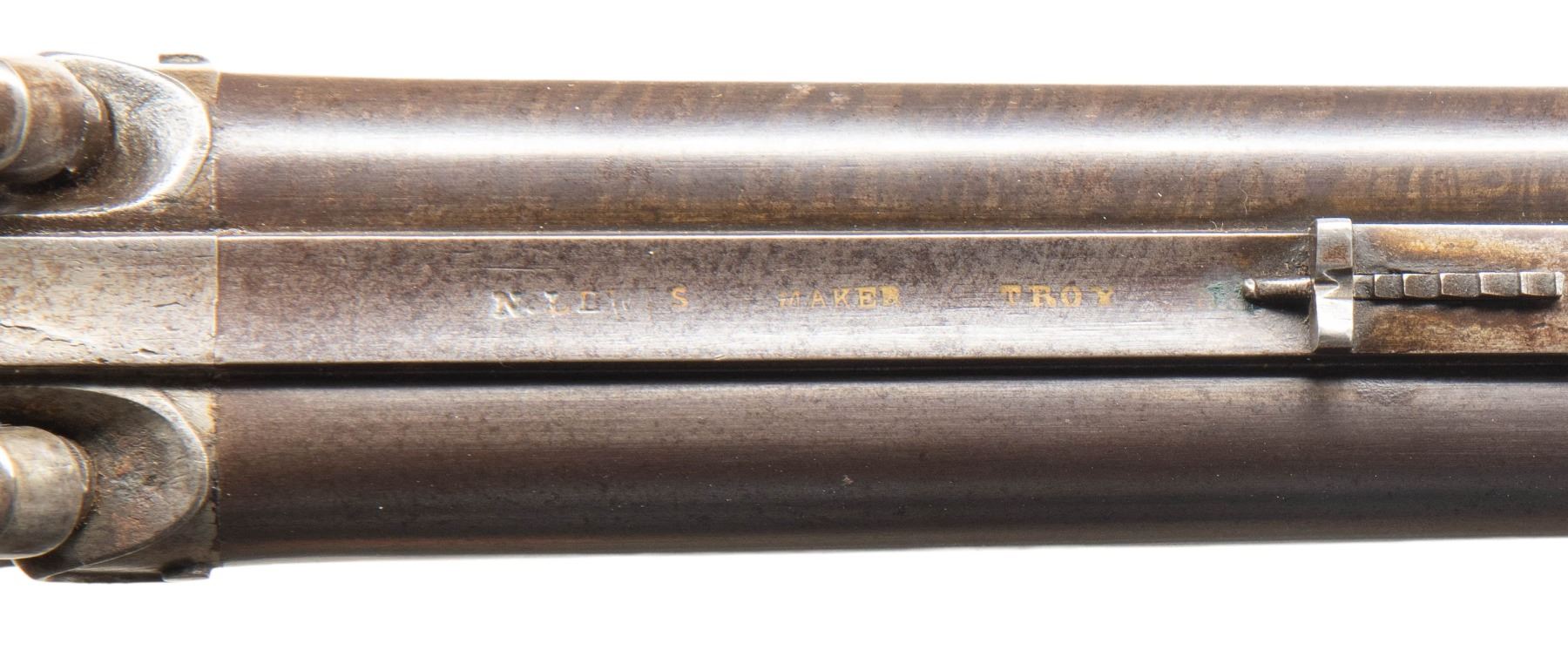 SXS RIFLE. Cal. 36 (right) x 16 Ga (left). NSN. Nelson Lewis operated 1843-1888 out of Troy, NY marking percussion guns (American Gunsmiths by Sellers). Bbls. 28.5". Concave rib has island mounted German silver blade front sight & elevator rear sight. Bottom rib holds 2 pipes & hardwood brass tipped ramrod. Back action locks; top tang has hole for sight. Wedge fastened walnut stock w/ cheekpiece. German silver furniture includes thimble, wedge escutcheons, spear finial triggerguard, elk's head on cheekpiece, circular patch box, crescent buttplate & toeplate. CONDITION: barrels have brown patina appearance with work marker's mark, spots of corrosion & cleaned pitting. Locks show varnish & spots of corrosion. Wood has extra varnish along with cracks around rear tip of triggerguard finial, dings & marks. Lock appears mechanically fine. Bores show oxidation & strong rifling. (01-28297/MD). ANTIQUE. $500-700.