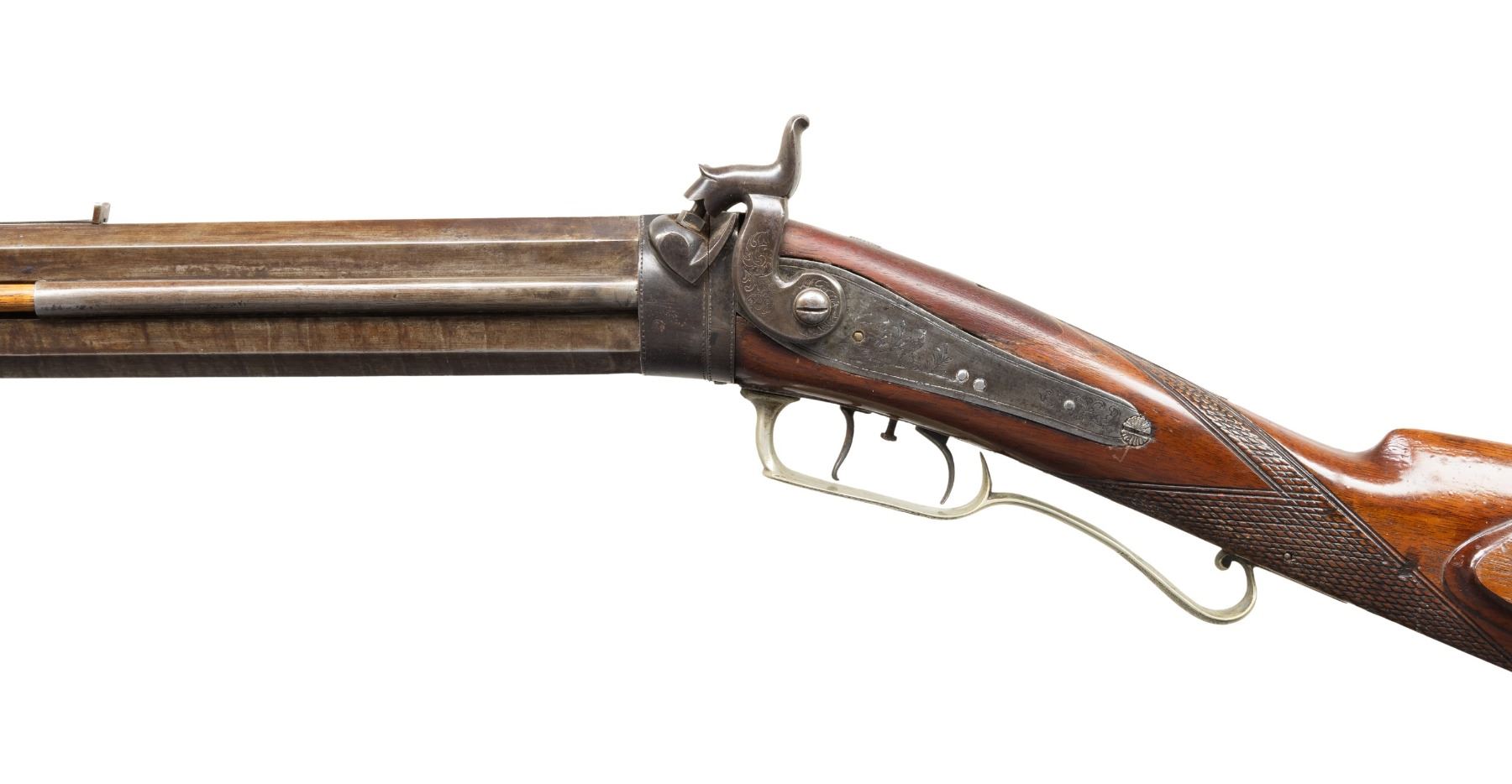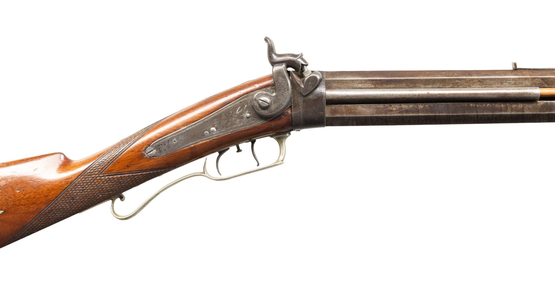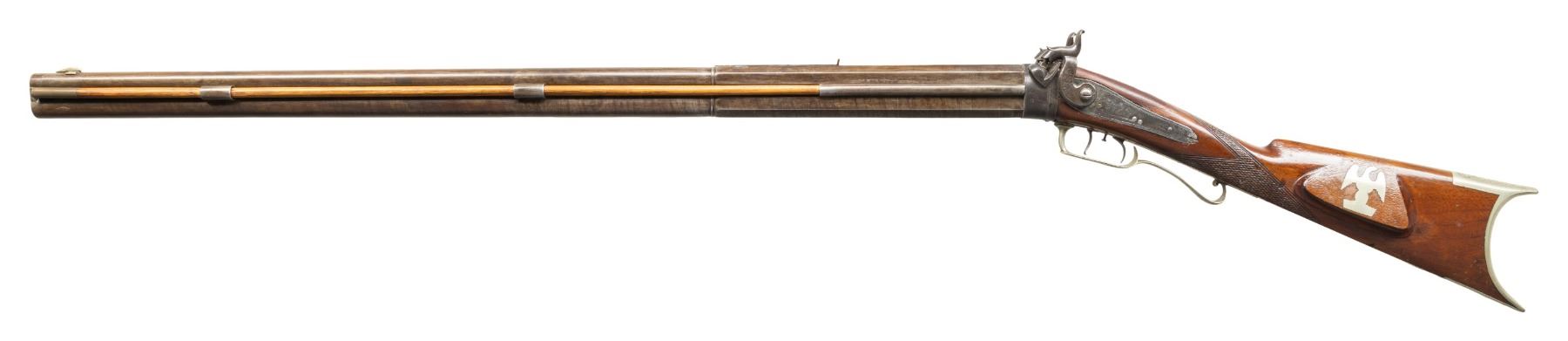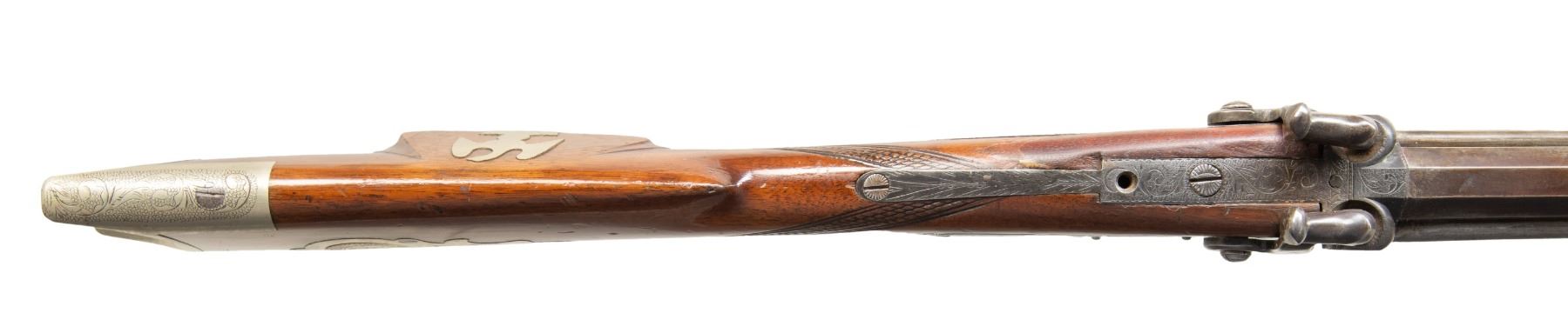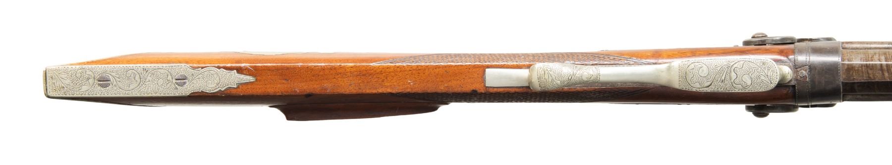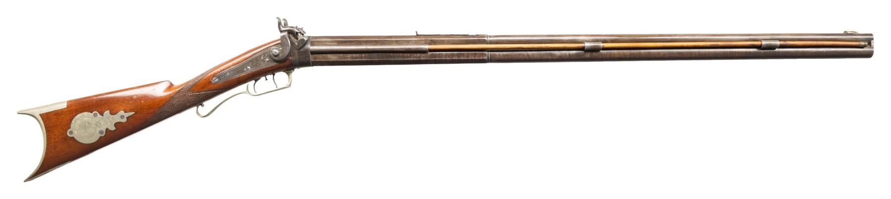 O/U GUN. Cal. 41 over 14 Ga. NSN. J. Ogden appears to be Jehiel Ogden, older brother of Walter & Charles Ogden that operated 1849-1870 out of Owego, NY. B Losey half oct., half rnd. 32.5" bbls. Side ribs hold hardwood ramrods with 2 pipes & bases. German silver blade front sight & elevator rear sight; missing elevator. This gun features detailed floral scroll engraving throughout including hammers, top tang, triggerguard bow, toeplate, & peak of crescent buttplate. Pheasant scene engraving on lock plates. German silver circular patch box has detailed floral & punch dot geometric engraving. Top tang has hole for sight. Walnut buttstock w/ checkered wrist & German silver on cheekpiece. CONDITION: barrels have brown/gray appearance with marks & cleaned pitting. Spliced wood repair to top of left side wrist. Wood shows heavy varnish with scattered sm. dings & sm. chips throughout. Strong rifling with some shine in top bore & shiny bore with scattered oxidation to bottom bore. Right lock unable to hold at full cock, left hammer mechanically fine. (01-28296/MD). ANTIQUE. $600-1,000.