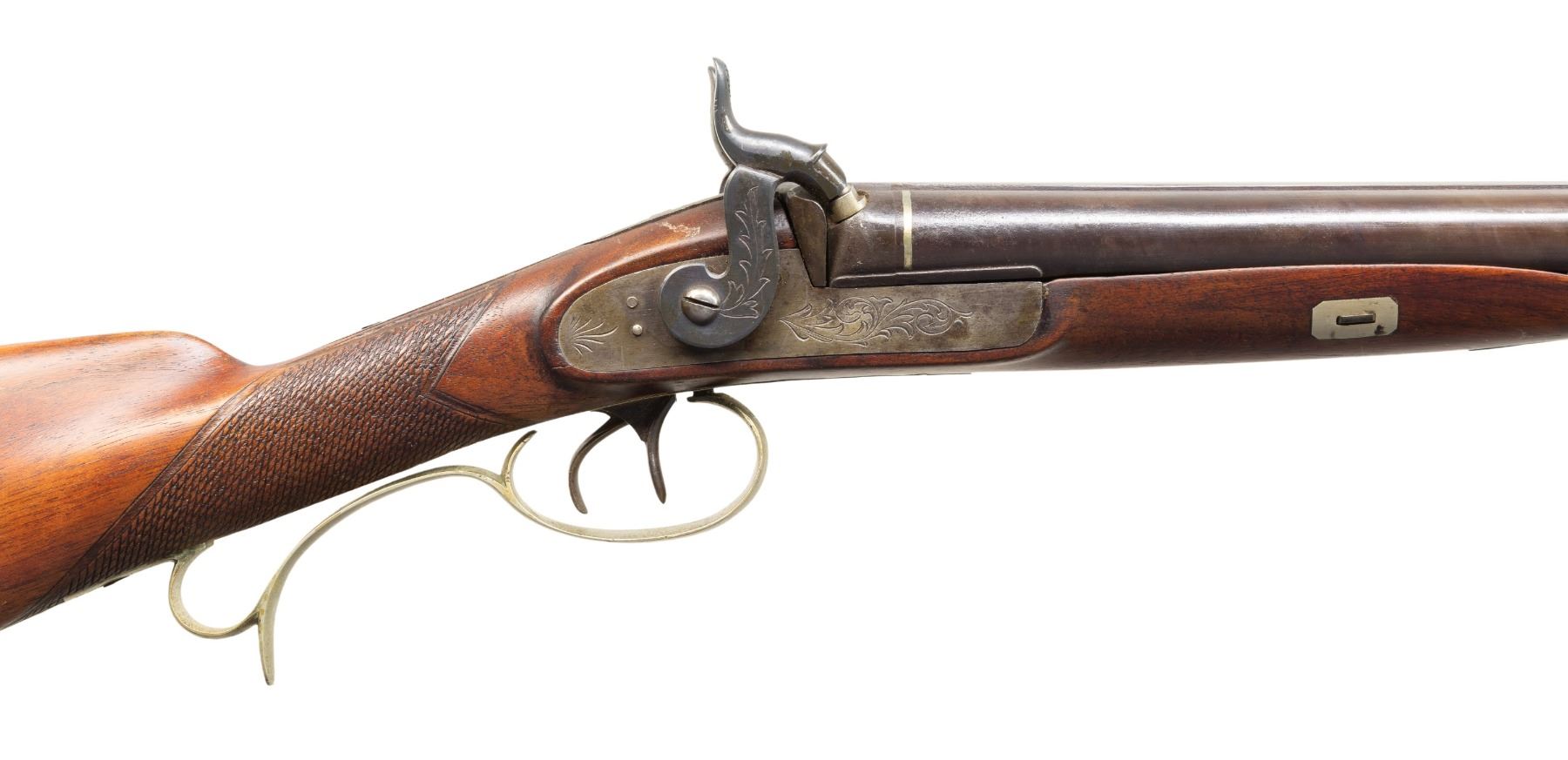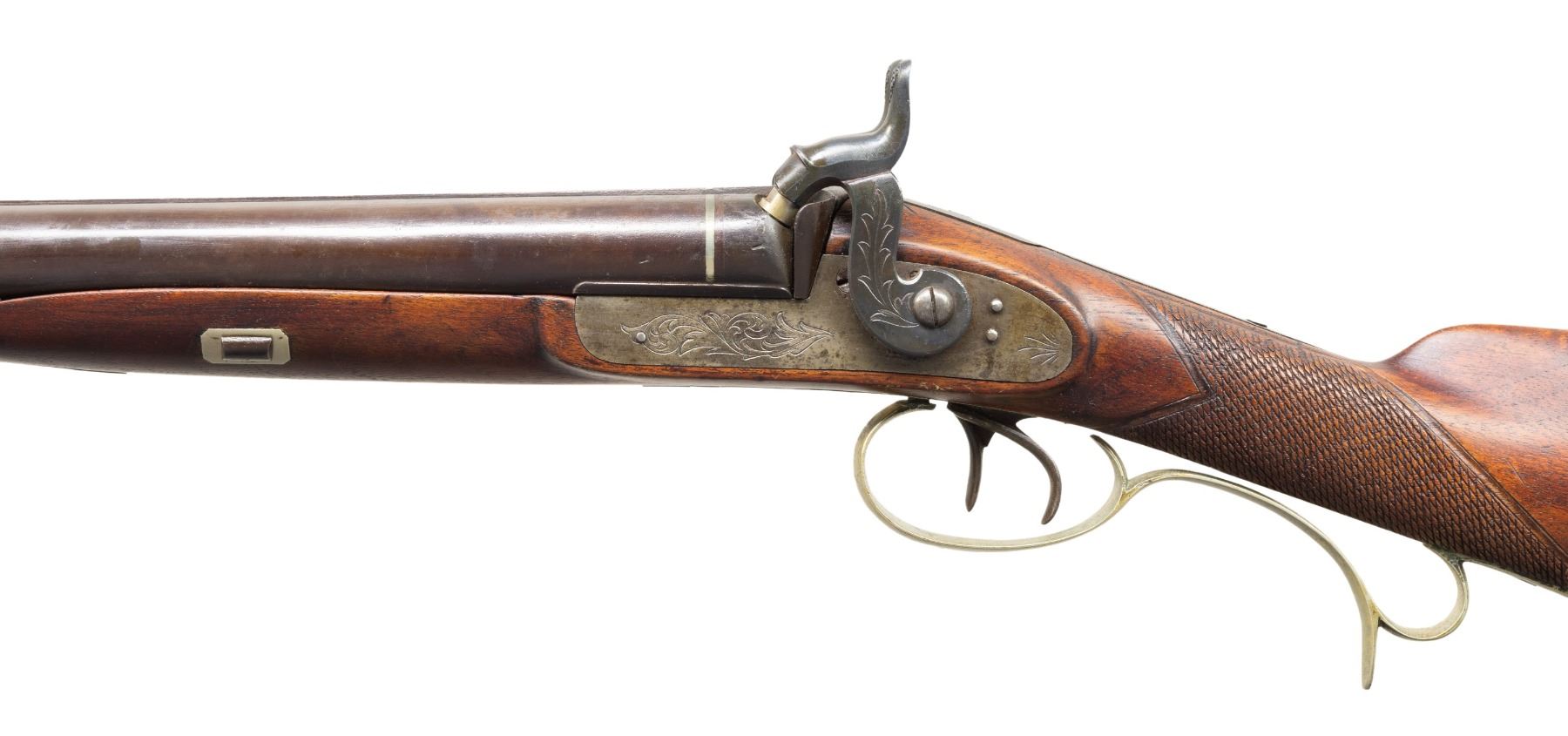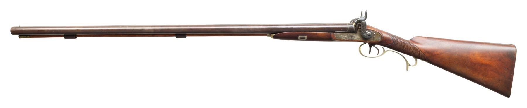 Cal. 36 (right) x 12 Ga. (left). NSN. Bbls. 32.5". Breech section has German silver band & replacement nipples; rib has brass bead at muzzle. Locks & action has floral engraving. Wedge fastened walnut stock w/ tall peak steel buttplate & German silver furniture including spear tip finish engraved finger curl triggerguard. CONDITION: barrels have brown patina appearance with cleaned pitting, areas of varnish & marks. Hammers show mix of blue & varnish; mechanically fine appear locks have gray appearance. Sanded & refinished wood has re-cut checkering at wrist with scattered marks. Silver shows tarnish & varnish. Dark bores show oxidation & pitting. PROVENANCE: Estate of Groves Herrick. (01-28327/MD). ANTIQUE. $400-700.