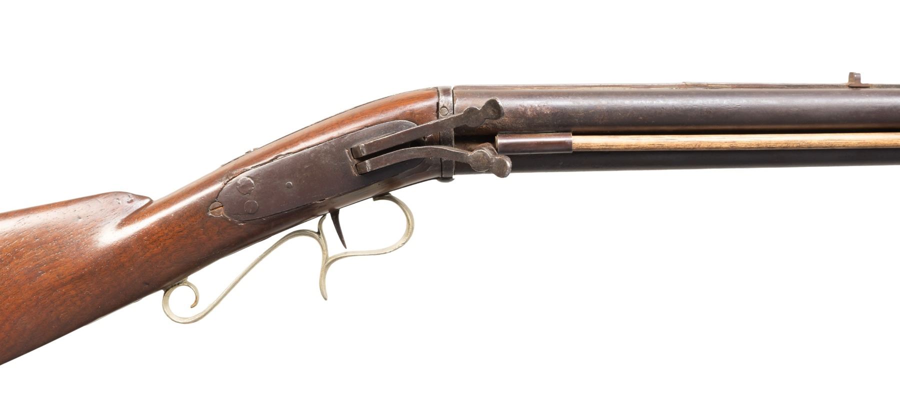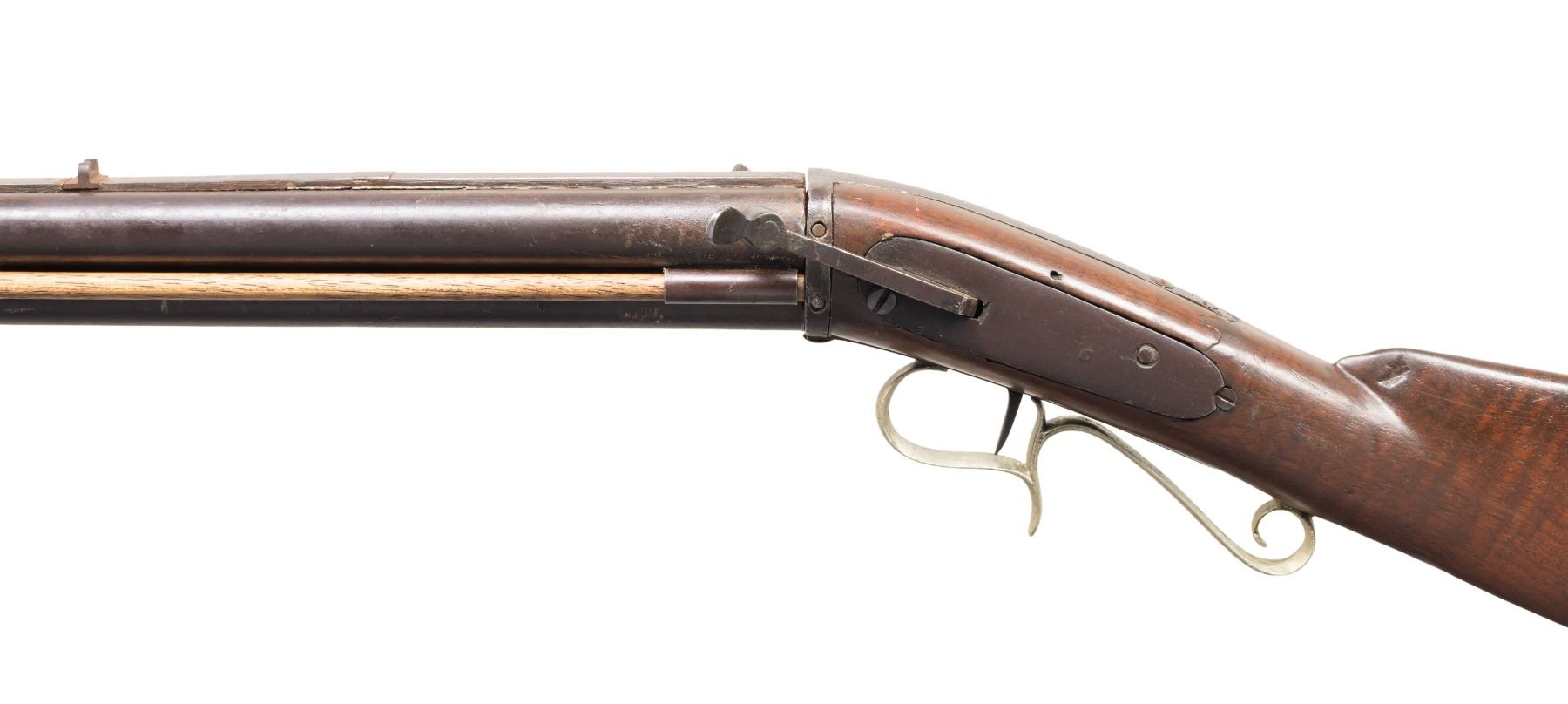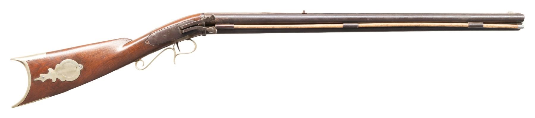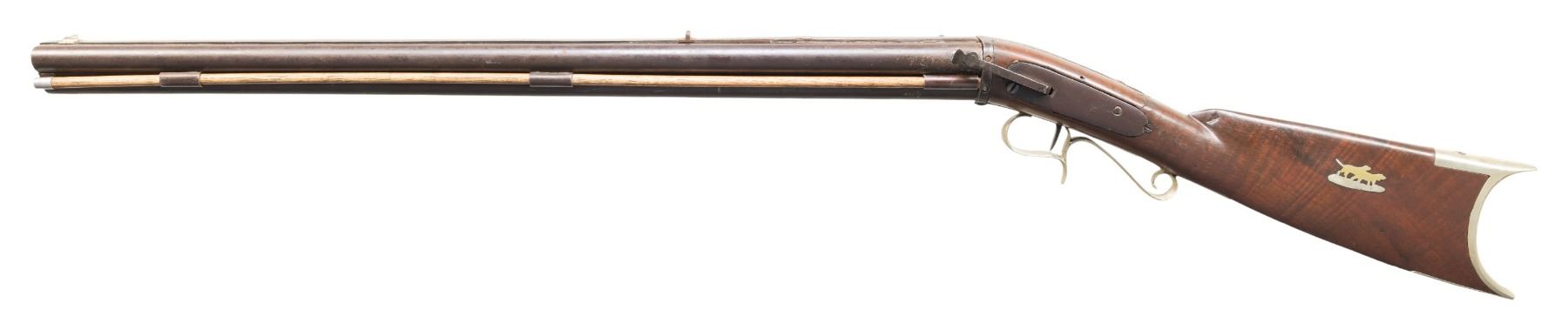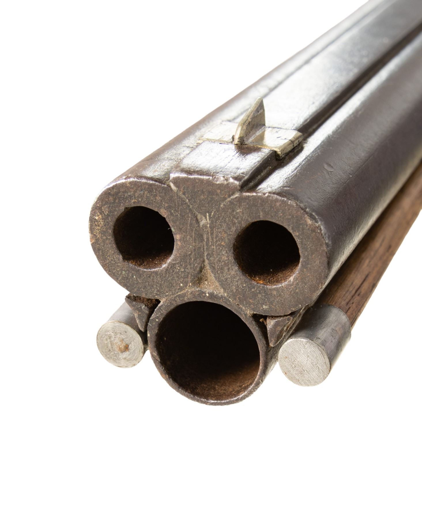 GUN. Cal. 40 x 40 / 69. NSN. Two top rifled bores & bottom smoothbore measure 26.5". Top rib has German silver blade front sight & iron notch rear sight. Side ribs & pipes holding 2 ramrod. Two mule ear locks with single trigger workings for all hammers. Walnut buttstock w/ German silver finger curl trigger guard, circular patchbox, crescent buttplate, toeplate & 2 dogs motif. CONDITION: metal has corroded appearance with deep marks & brazed repair to rib near rear sight. Sanded & refinished wood has large break that goes between locks & through top tang; left lock & right lock has shows areas of epoxy repair. Dark bores. Appears mechanically fine. PROVENANCE: From the PMRB Collection. (01-28443/MD). ANTIQUE. $800-1,200.