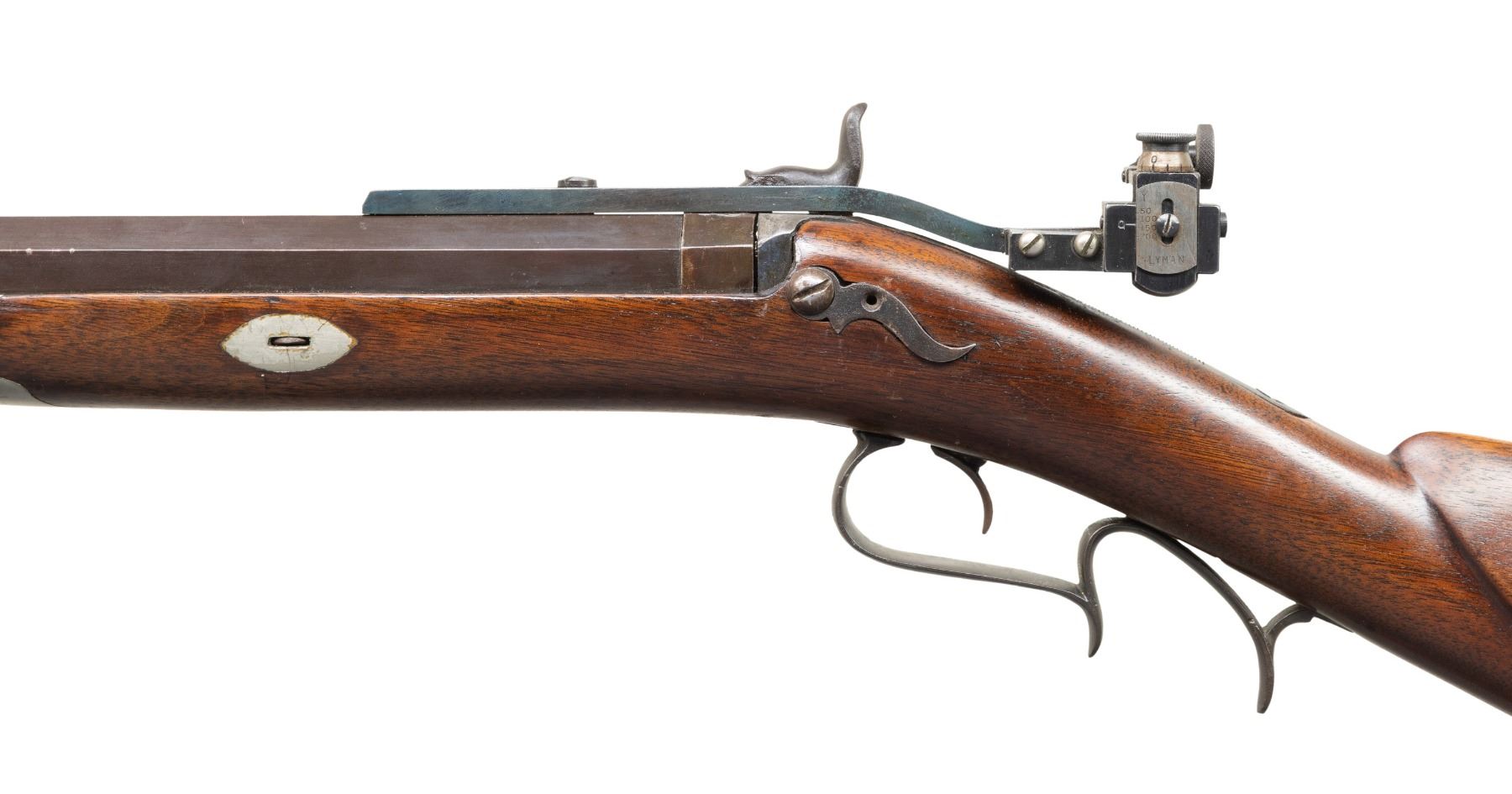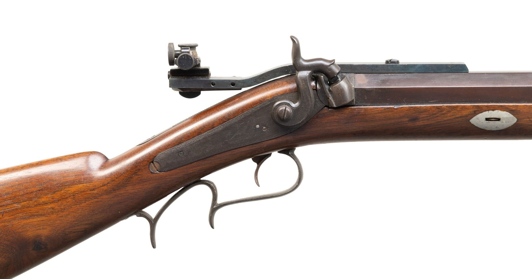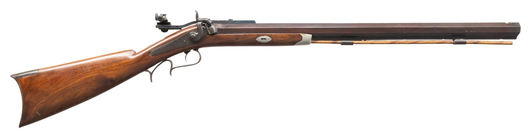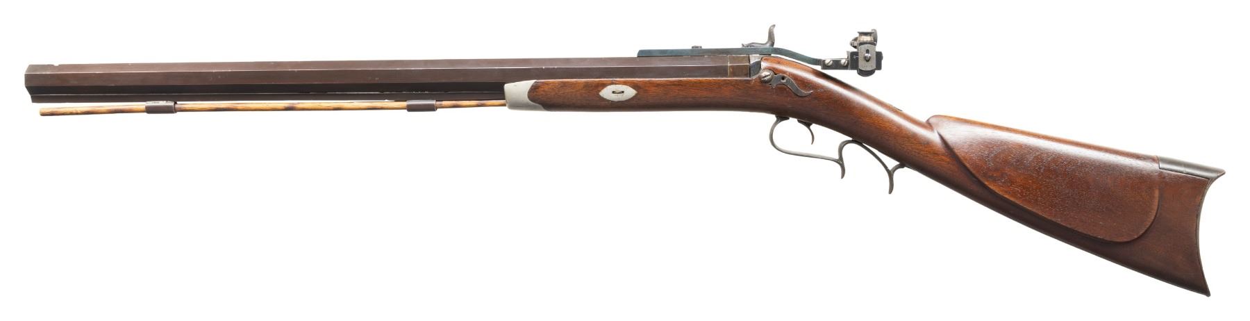 Cal. 45. NSN. Oct. 24". Back of barrel has 8" extended staff holding Lyman 57EW receiver sight; open front dovetail. Under rib has 2 pipes holding hardwood ramrod. Back action lock w/ single trigger. Wedge fastened walnut stock w/ beavertail cheekpiece, crescent buttplate & finger curl triggerguard. Pewter appearing nosecap & wedge escutcheons. CONDITION: barrel has brown finish with a few spots of oxidation; other metal shows brown patina finish with light pitting. Wood shows very good finish with light handling marks. Bore shows strong rifling w/ some shine & oxidation. PROVENANCE: Estate of Groves Herrick. (01-28370/MD). ANTIQUE. $400-600.