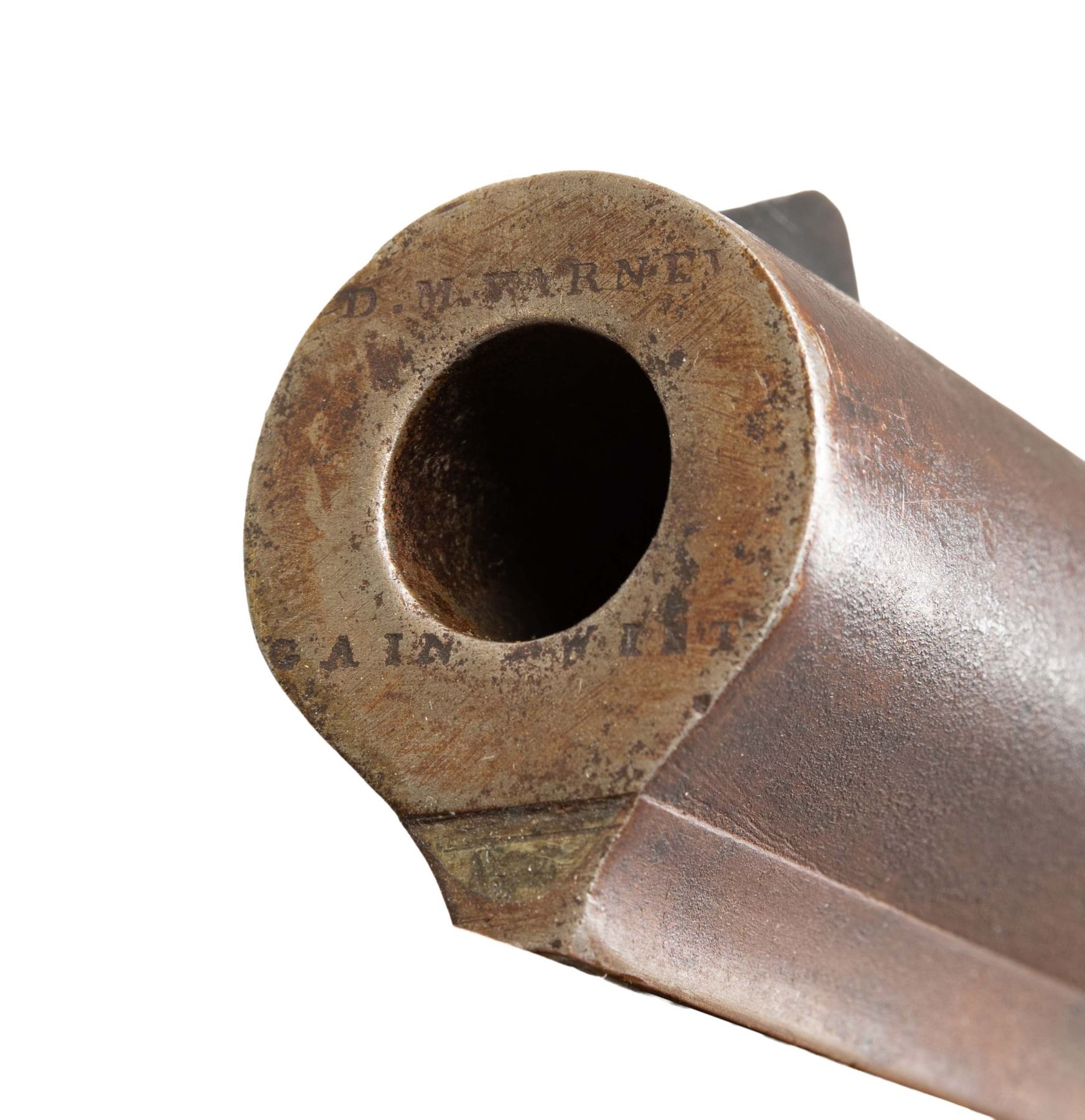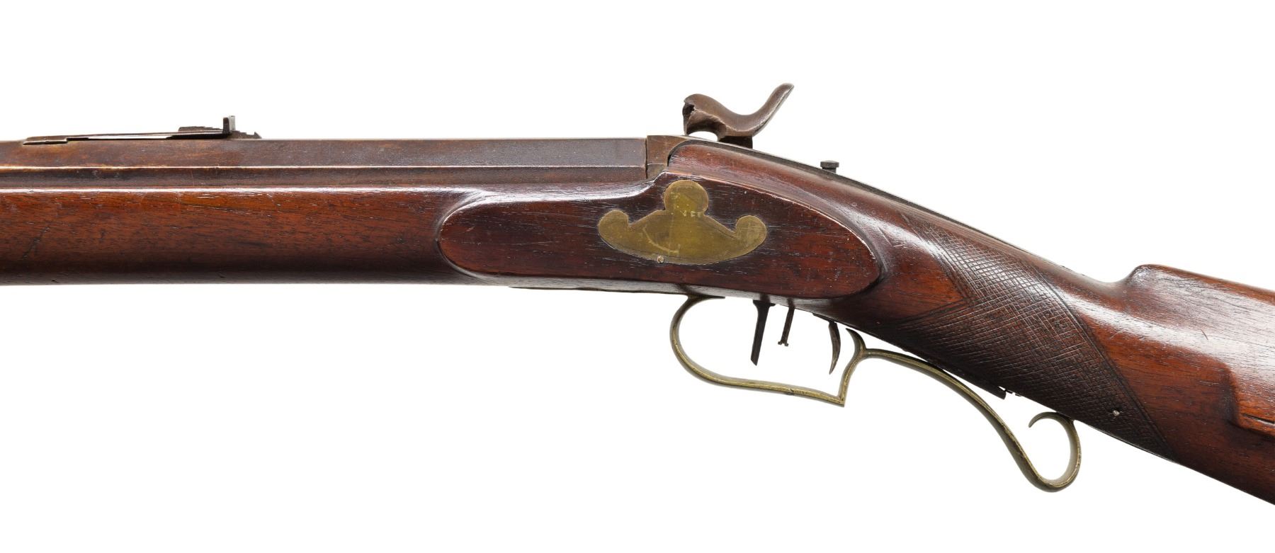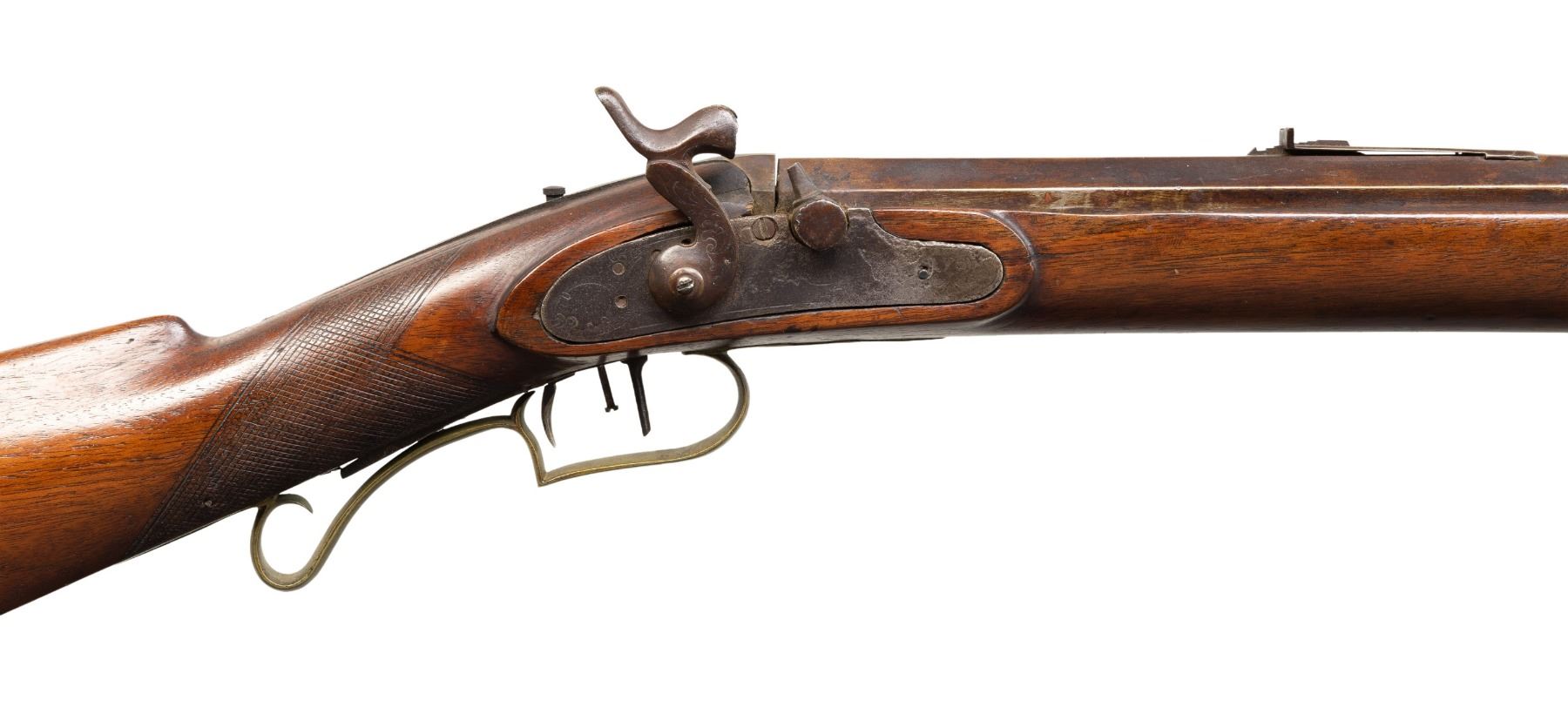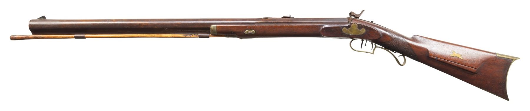RIFLE. Cal. 58. NSN. Per "American Gunsmiths" by Frank Sellers, David M. Varney was in Burlington, Vermont from 1842-1875. Round 29.5" barrel having Gain Twist rifling. Blade front sight, elevator rear sight. Extra barrel tang screw for sight base. Percussion lock marked "RIDDLE" in banner. Dbl. set triggers. Wedge fastened, half stock walnut stock w/ oversized hardwood ramrod, pewter nose cap. Brass furniture including crescent buttplate, toeplate, spear tip finial finger curl triggerguard, sideplate, lamb on cheekpiece. German silver plated thimble & wedge escutcheons. CONDITION: bbl has brown corroded appearance with pitting & wear streaks. Lock has pitted appearance with non-functioning hammer. Wood has worn appearance with large cracks, smoothened checkering, numerous dings & marks. Wedge is loose to cutout. Bore has outlines of rifling with pitting throughout. PROVENANCE: The Esteemed Norm Greenberg Collection. (01-27747/MD). ANTIQUE. $500-800.