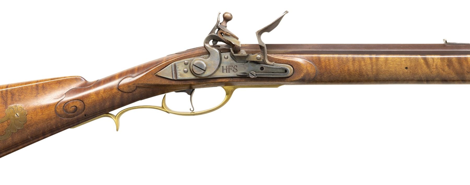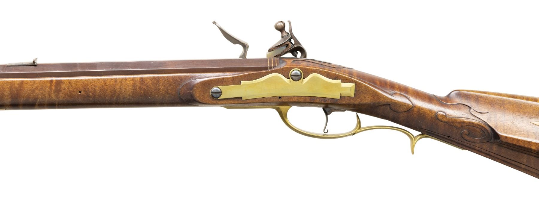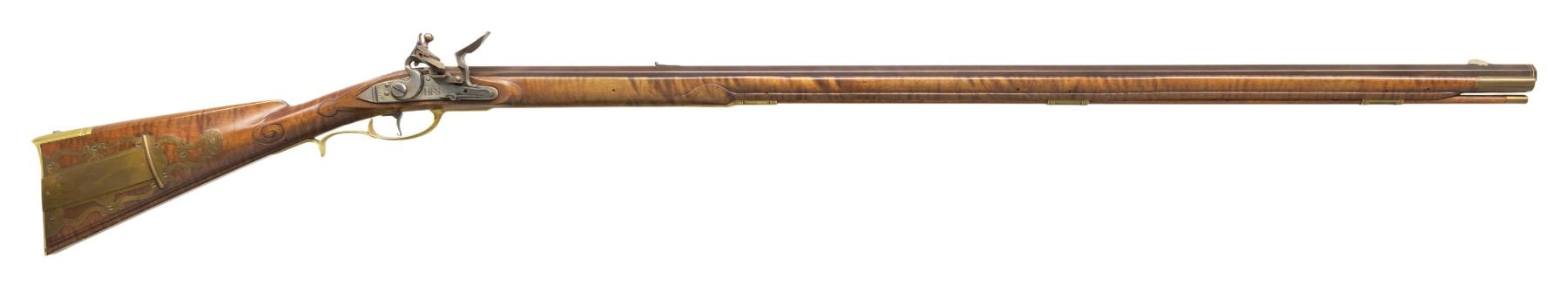 Cal. 45. NSN. Bbl. 40" oct. Sterling silver blade front sight. V-notch rear sight. 1975 made Kentucky style rifle assembled by master gunsmith William Kennedy. Rifle is made in the style of Lancaster County in the early golden age. Lock marked "HFS". Bbl. has "W KENNEDY" signature. Bbl. has browned finish. Lock assembly has bright finish. Curly maple full length stock with brass furniture. Hardwood ramrod secured by brass pipe & one thimble. Daisy head patchbox & star inlay on cheekpiece. Stock also features carvings. UNATTACHED ACCESSORIES: paperwork detailing Kennedy's work & information on this rifle. CONDITION: stock shows a light small chip on left front of forend & some minor handling marks. Brass parts remain partially bright with areas turning dull yellow, some handling wear & scattered tarnishing. Lock assembly remains partially bright with hammer turning a dull gray & some scattered oxidation specks. Bbl. is turning a dull gray color with some edge wear, light oxidation specks & light handling marks. Action functions properly when hand cycled. Very good plus bore with strong rifling. (01-27978/MJC). ANTIQUE. $800-1,200.
