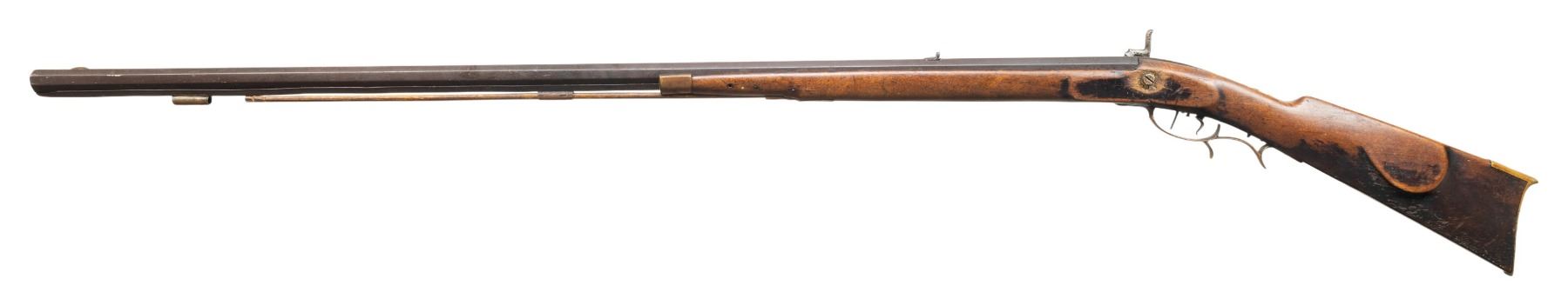 HALF STOCK PERCUSSION RIFLE. Cal. 45. NSN. Solomon H. Ward, so of James Ward, operated from 1865-1884 (death) in Jamestown, North Carolina. Oct. 41.5" w/ German silver blade front sight & notch rear sight. Top of barrel marked "VI S.H.WARD JAMESTOWN, N.C.". Bottom of barrel has iron underrib with 2 pipes holding replacement undersized hardwood ramrod. Poorly fitted percussion lock; dbl. triggers. Half stock pinned walnut stock w/ beavertail cheekpiece; brass furniture includes nose cap, thimble, finger curl triggerguard & crescent buttplate. CONDITION: barrel has dark brown corroded appearance with cleaning around maker's stamp. Lock has pitted cleaned gray appearance; appears mechanically fine when cycled by hand. Wood shows numerous dings & marks with pinned plate near hammer, cracks near lock screw & peeling finish around toeline. Dark pitted bore. (01-28303/MD). ANTIQUE. $500-800.