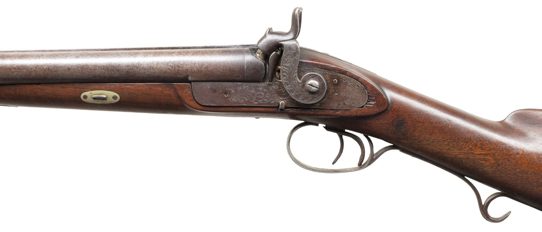 Cal. 12 Ga. NSN. Bbls. 29.5" w/ bright front stud & modern replacement nipples. Engraved hammer locks. Wedge fastened walnut stock w/ German silver wedge escutcheons, additional finger rest added to spear tipped finial triggerguard & metal buttplate. CONDITION: gray/brown patina barrels & lock with spots of corrosion & marks. Fair wood finish with extra finish on right side buttstock. Fair pitted bores. Mechanically fine. PROVENANCE: Estate of Groves Herrick. (01-28317/MD). ANTIQUE. $100-200.