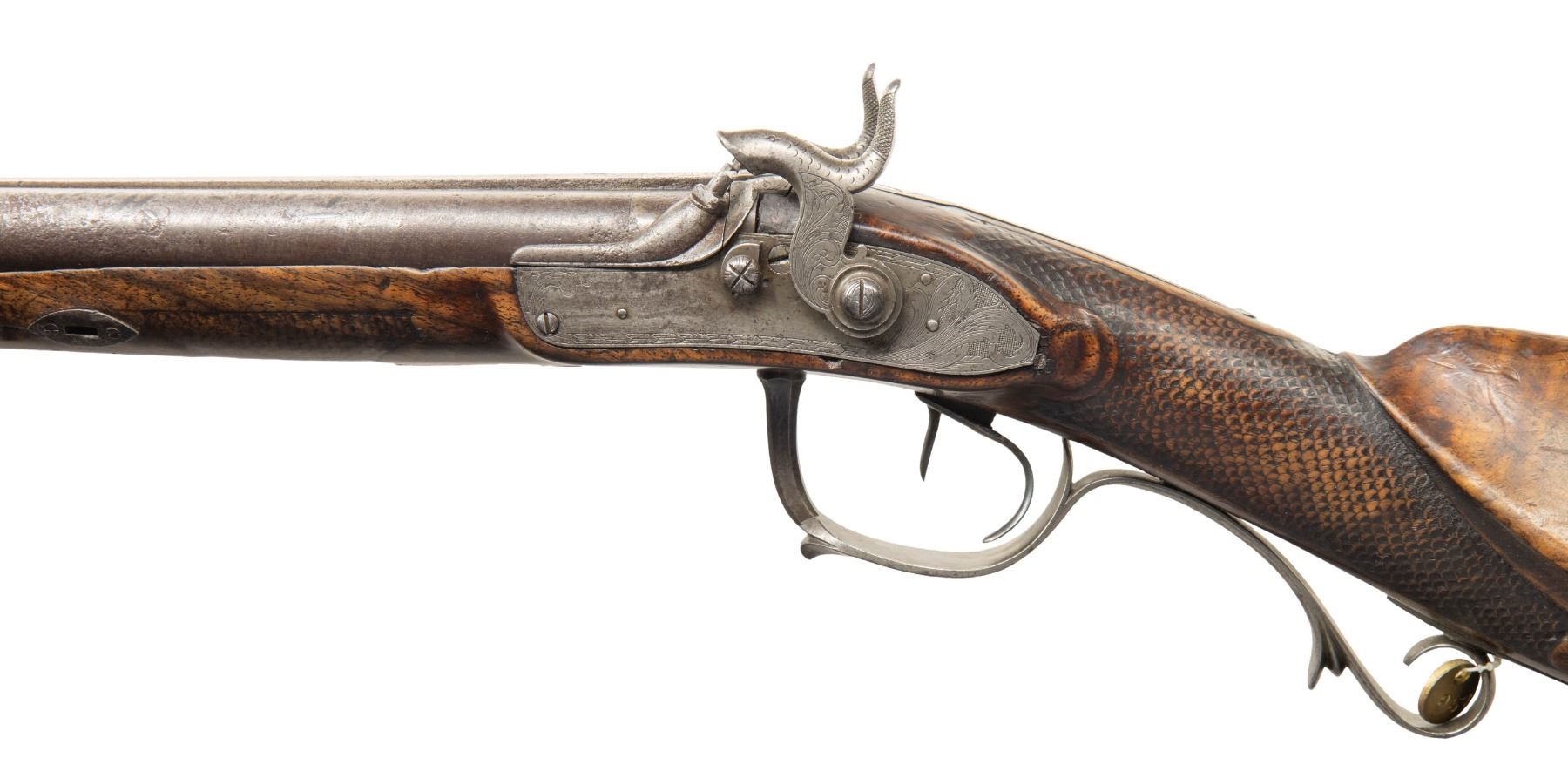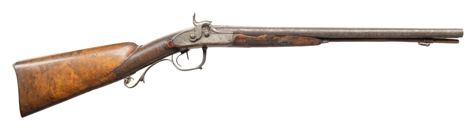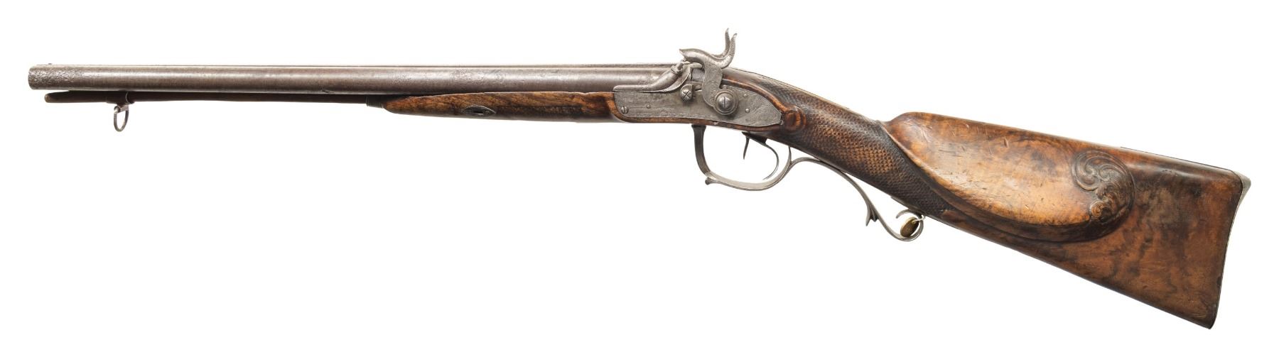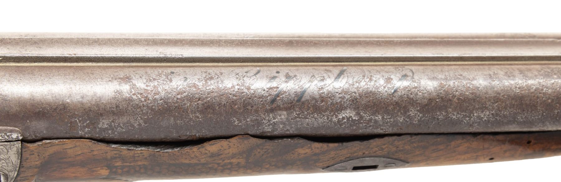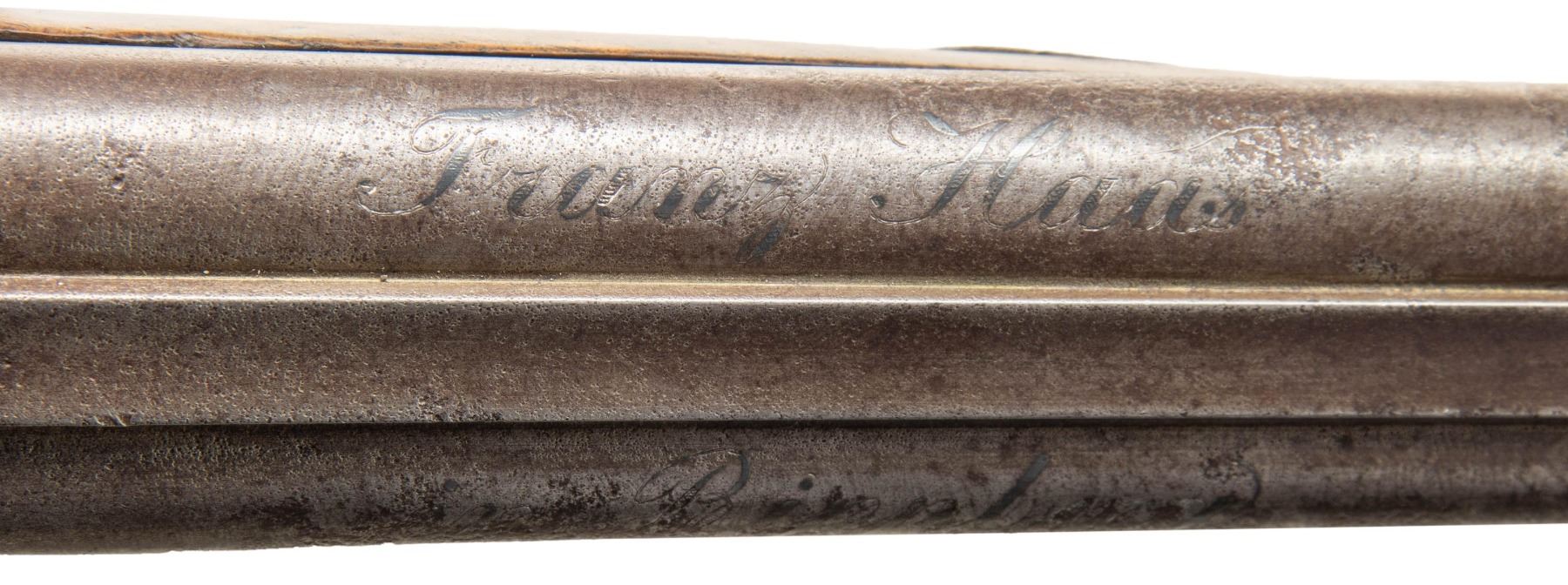 SHOTGUN. Cal. 20 Ga. NSN. Bbls. 18" w/ flattened bead, hardwood ramrod, 2 pipes with 1 having swivel. Top of barrel has silver inlaid maker's mark partially discernable "Franz Haas". Hammers & locks have floral & dragon scale engraving. Walnut stock w/ spear tip finial finger curl triggerguard, fish scale checkering, raised cheekpiece with floral carving & bone plug for previous swivel. CONDITION: barrel has heavy pitting throughout. Other metal has gray patina appearance. Wood has worn appearance with numerous handling marks, sm. chips & cracks. Pitted bores. Right lock appears mechanically fine with chipped edges to cup of hammer. Left lock appears unable to go to full cock. PROVENANCE: From the PMRB Collection. (01-28448/MD). ANTIQUE. $200-300.