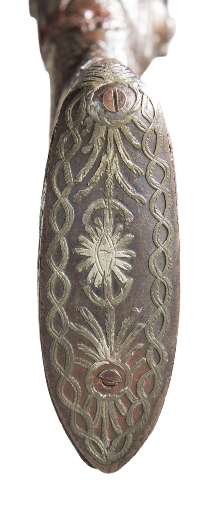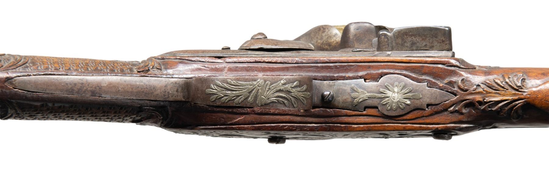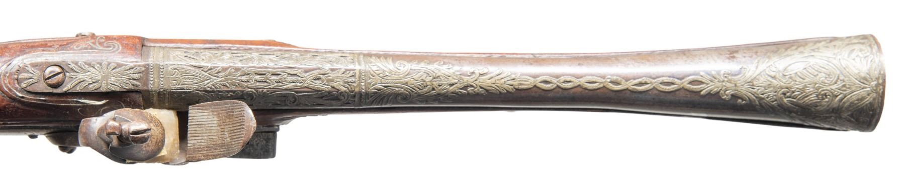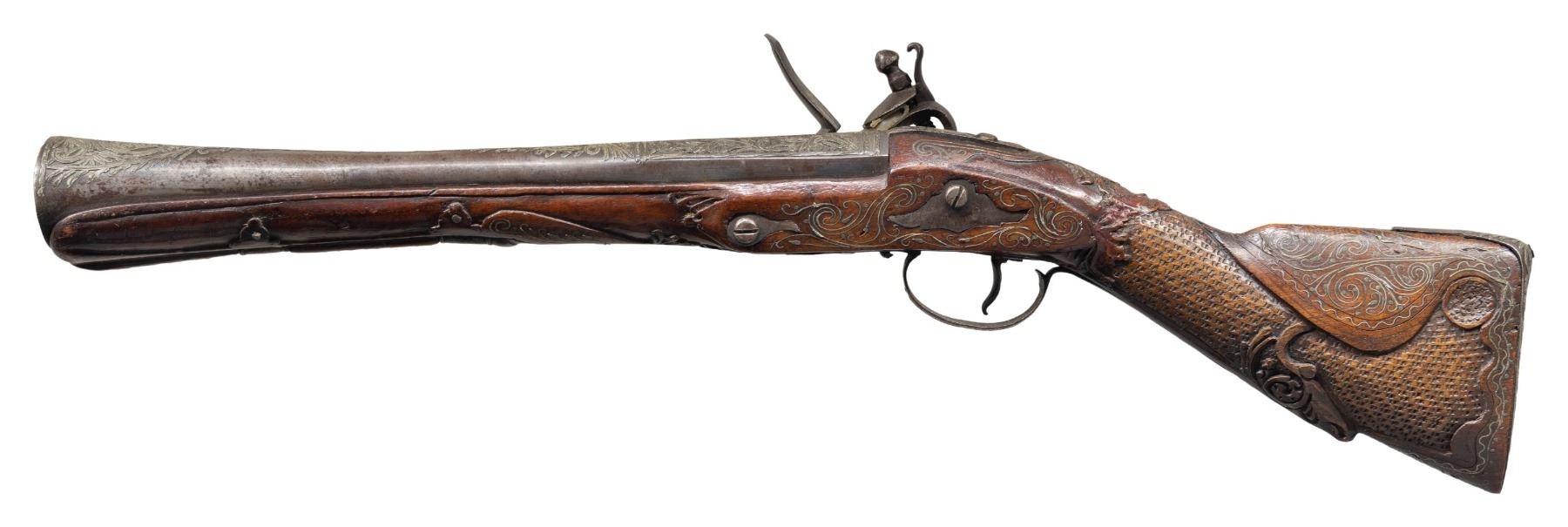 FLINTLOCK BLUNDERBUSS. Cal. 1 3/8" (at flared muzzle). NSN. Bbl. 12". Flintlock blunderbuss likely of Eastern European origin. Lockplate features light vine type scroll engraving. Bbl. features a faceted breech section which transitions to a rnd. bbl., terminating in a large flare at the muzzle. Top of the bbl., bbl. tang, trigger guard, and buttplate feature flattened and foliate engraved metal ornamentation. Stock features areas of relief carving and wire inlays overall, with textured panels present on the butt/wrist. Left side of stock features 2 iron sideplates. Overall length of gun measures approx. 20 15/16" from the muzzle to the buttplate. CONDITION: lock assembly has faded to a mottled gray patina, showing scattered spots/areas of light to mild surface oxidation. Bbl., sideplates, trigger guard, and buttplate retain traces of bluing in protected areas. Hammer does not hold when trigger is pulled at half cock, but lock otherwise retains proper manual mechanics. Stock shows some scattered superficial handling marks and minor impressions, with some minor chipping present along the bbl. channel and lockplate. Wire inlays remain mostly intact, with some losses. PROVENANCE: The Esteemed Norm Greenberg Collection. (01-27693/MLW). ANTIQUE. $700-1,000.