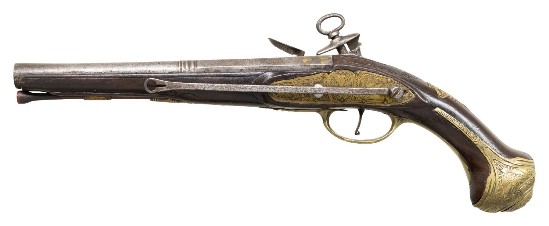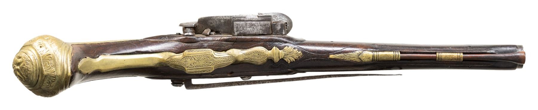 BARCELONA CA 1725. Cal. 60. S# NSN. The 9-3/4" octagon to round barrel transitions through multi-turned rings. Top of rear flat is marked with poincon (gold missing) for Manual Cams. There are seven other gold filled "V" stamps ranged around maker's mark. Miquelet lock with external spring has relief scroll engraved cock. Matching engraving is on housing for pan, frizzen and feather spring. Castle shaped gold poincon for unknown lock maker is on back of frizzen and lockplate. European walnut knobbed grip stock extends to muzzle and is pinned to barrel. There are mouldings around most elements enhanced by some raised carving behind barrel tang. Brass mounts are engraved with scrolls and arms and have relief carved grotesque face on bottom of grip. Chamfered trigger guard has foliate finial and a crowned crestplate is at top of grip. Flat sideplate engraved with women's face at center is mounted with 7-1/2" steel belt hook with pierced tip. Slim rosewood ramrod mounts through beaded pipe and matching thimble. CONDITION: good. Iron and steel parts with old cleaning to gray and brown. Stock with old finish has some marks and rubs. Brass is mustard yellow. Bore is dark and pitted. Lock is good with very strong main spring. PROVENANCE: Estate Collection of Nicholas Apergis. (01-27514/MGM). ANTIQUE. $1,000-1,500.