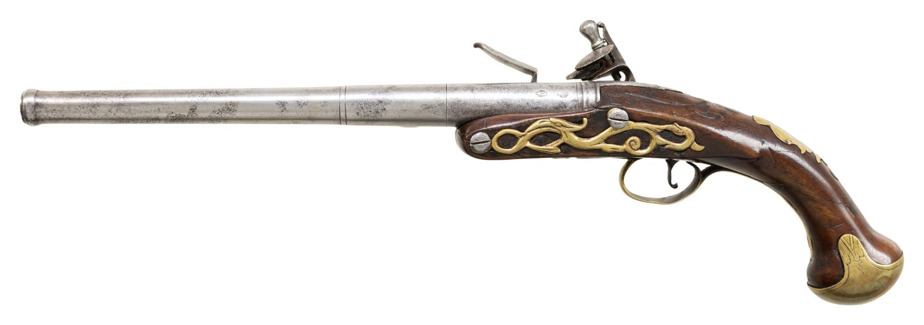 PISTOL BY, T. PEELE. Cal. 50. S# NSN. The 9" screw off barrel with turned ring at muzzle is unmarked. The 3-1/2" breech section is stamped with London black powder proofs and has some foliate engraving. Early style flint lock with long rounded plate has round bodied serpentine cock, integral round pan, unbridled friction frizzen and feather spring with acorn finial. Lock has some simple scroll engraving with "PEELE" at center (T. working in Whitehaven, Cumberland, Great Britain 1720-60). European walnut half stock with knob grip has raised carved mouldings and scroll behind top tang and is brass mounted with short spurred grip cap, double beaded trigger guard with husk finial and long multi-pierced scrolling sideplate. An unmarked fancy crestplate is at top of grip. CONDITION: fair to good. Iron and steel showing extensive cleaning and wear over the years are presently pitted silver gray. Brass is cleaned, beginning to tone. Stock shows considerable repairs at grip with some replaced wood under lockplate. Bore is dark. Working lock has weak feather spring. PROVENANCE: Estate Collection of Nicholas Apergis. (01-27417/MGM). ANTIQUE. $1,000-1,500.