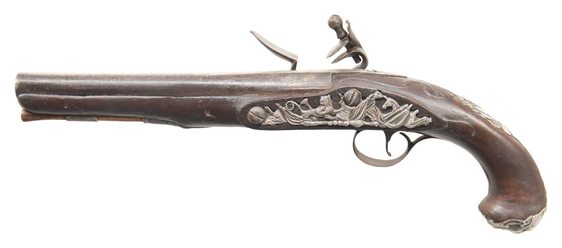 Cal. 60. S# NSN. John Clark is known to have been working at 133 Holborn Hill, London in 1783 and is most likely the maker of this pistol that has 8" barrel faceted ovate at breech and swamped to flare at muzzle. Round bodied flint lock with rounded serpentine cock, integral rounded pan, bridled friction frizzen and feather spring with spear finial is engraved "CLARK" under pan. Dark European walnut, knob grip stock extends to muzzle and is pinned to barrel. Simple mouldings are around lock and side plates and a carved shell is behind barrel tang. Steel trigger guard has husk finial. Other mounts are unhallmarked relief cast silver, with grotesque mask grip cap, pierced sideplate with arms, unicorn and lion and vacant crest plate at top of grip with scroll and satyr's head. Replaced ramrod mounts through steel beaded pipe and matching thimble. CONDITION: fair to good. Iron and steel parts considerably pitted and are mostly dark brown but show some cleaning to silver. Stock is sound but shows heavy wear of its old, possibly original, finish. Silver is good; moderately rubbed. Bore is dark and pitted. Lock is good; frizzen spring weak. PROVENANCE: Estate Collection of Nicholas Apergis. (01-27434/MGM). ANTIQUE. $1,000-1,500.