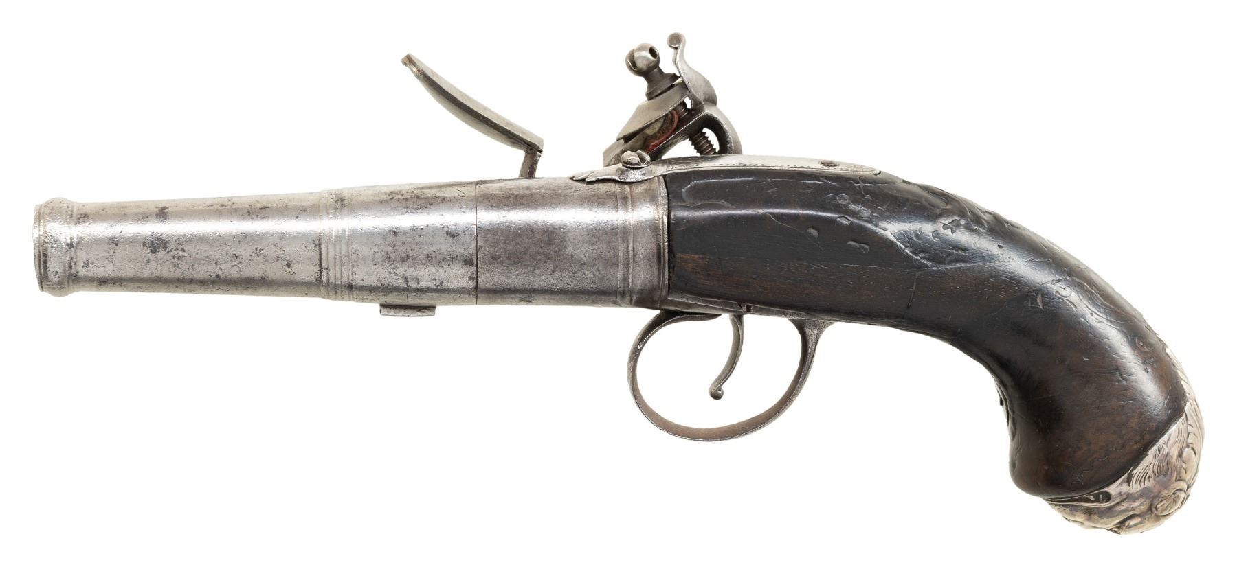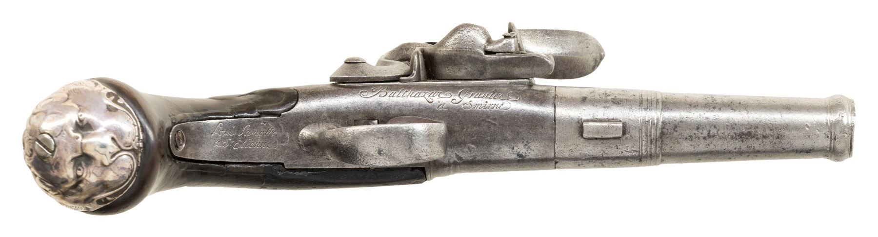 PISTOL BY LOUIS LAMOTTE WITH SILVER MOUNTS. Cal. 60. S# NSN. 10" overall this pistol has 3-3/4" cannon turned screw off barrel that is unmarked. Breech with integral flint lock on right side is engraved "Louis Lamotte" "a' St. Etienne" (probably working 1747-1791) on bottom tang. Area under lock is engraved "Balthazar Granier" "a. Smirne" (a Turkish retailer ?). Lock features round bodied reinforced cock, rounded pan and bridled friction frizzen, with feather spring that mounts at center of lock and curls under pan. Trigger guard slides to act as a safety. Burl figured European walnut knobbed pistol grip stock has some relief carving behind barrel tang and silver grip cap of a lion's face which has London hallmarks for 1754, Sterling and with maker's mark "PL". CONDITION: fair to good. Barrel and action cleaned to silvery gray brown. Stock shows considerable wear and repairs on grip. Silver is good. Bore is rough. Mechanically good. Trigger guard safety loose. PROVENANCE: Estate Collection of Nicholas Apergis. (01-27555/MGM). ANTIQUE. $1,000-1,500.