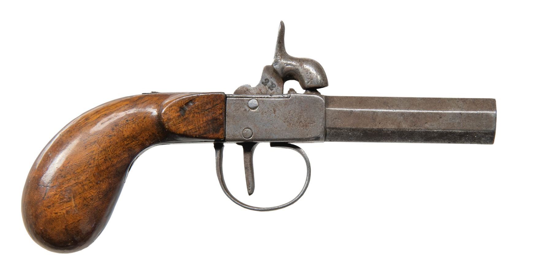 Cal. 45 Smoothbore. NSN. Bbl. 2 3/8". Percussion muff produced by an unknown mfg., likely of Belgian origin. Pistol is virtually unmarked, save for a "22" stamped on the right side of the hammer and "./ 25" stamped on the interior of the trigger guard bow. Octagonal bbl., with flat trigger, and slightly offset (to the right) hammer. Metal components have been cleaned and polished in-the-white at one time. 1-piece rnd. butt plain wood stock exhibits an added layer of varnish. Forward screw is absent on the lower tang. CONDITION: metal components have faded to a gray patina, exhibiting scattered patches and areas of light surface oxidation, pitting, and age related discoloration overall. Action functions appropriately when cycled by hand, save for the hammer, which still trips at the half-cock position. Stock shows some scattered marks and impressions, but otherwise remains sound. PROVENANCE: Estate of Groves Herrick. (01-28355/MLW). ANTIQUE. $100-200.