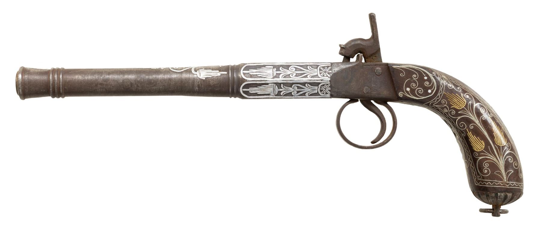 BOXLOCK PERCUSSION PISTOL. Cal. 48 Smoothbore. NSN. Bbl. 8 1/2". Boxlock percussion pistol of unusual design, likely of Eastern European / Mediterranean origin. The bbl. features raised silver colored ornamentation along the top, which is also present around the circumference of the faceted breech section. Additionally, the bbl. features 2 bands at the end of the breech, with 3 bands approx. 7/8" from the cannon flared style muzzle. 1-piece wrap around wood grip features ornate wire inlays that terminate in apparent gold or brass foliate patterns. Rnd. grooved pommel cap with lanyard stud and ring. Bbl. appears to have been turned on a lathe, and is not inline with the breech area on the interior, with the breech extending into bore approx. 1/8" at its widest point in the upper left quadrant. Action is relatively crude comparatively, featuring 2 hammered pins for the unadorned hammer and trigger mechanisms. CONDITION: metal components have faded to a dark gray patina, exhibiting patches of mild pitting predominately on the action. Raised ornamentation appears to have been cleaned at one time, exhibiting a bright appearance. Action functions appropriately when cycled by hand. Grip shows some superficial marks from handling and storage, with wire inlays remaining intact. An extremely unusual Eastern European / Mediterranean boxlock percussion pistol. (01-28220/MLW). ANTIQUE. $500-800.