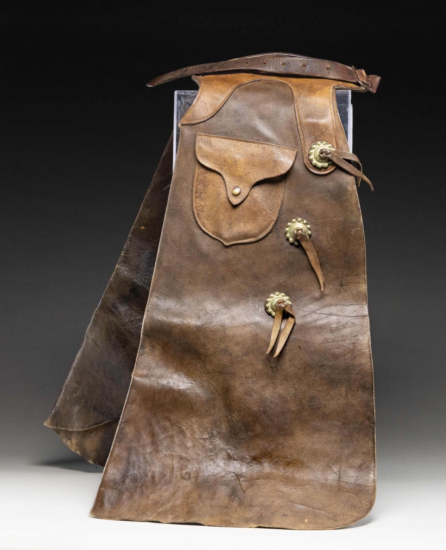 Chaps measure approx. 37" x 18" w/ German silver conchos & leather front pouches. CONDITION: chaps in fair worn condition with cracking of leather & scuffs. (02-25255/MD). NON-GUN. $300-500.