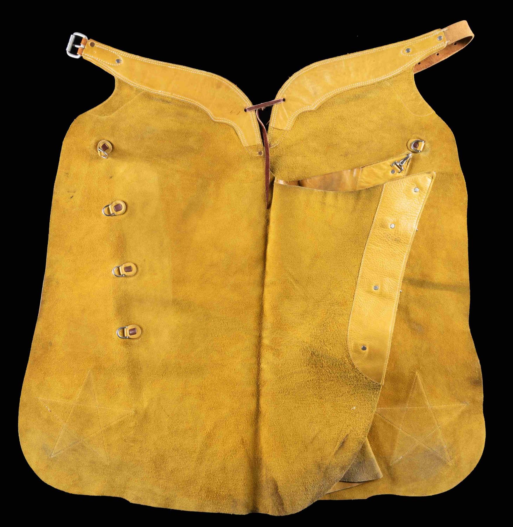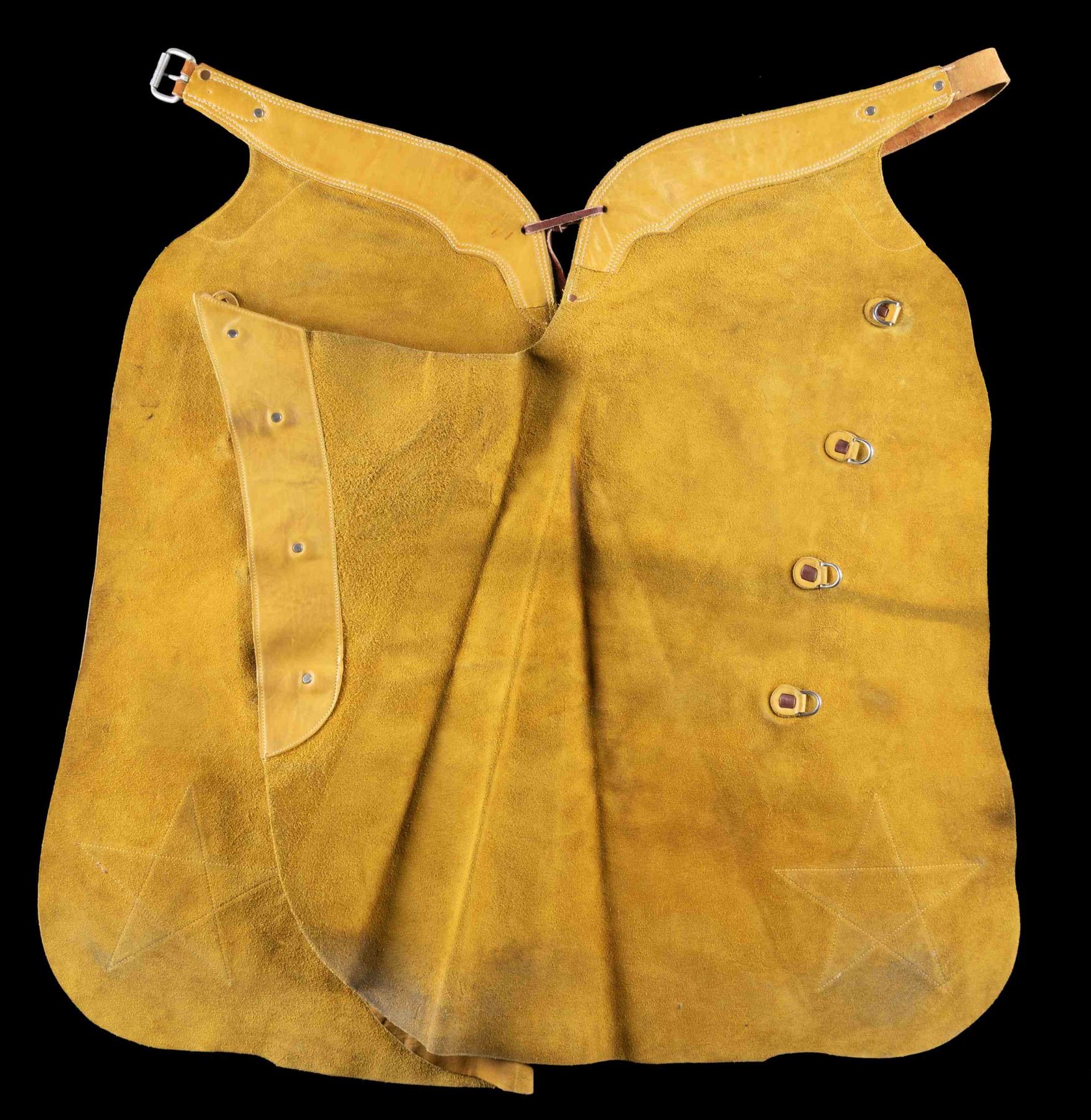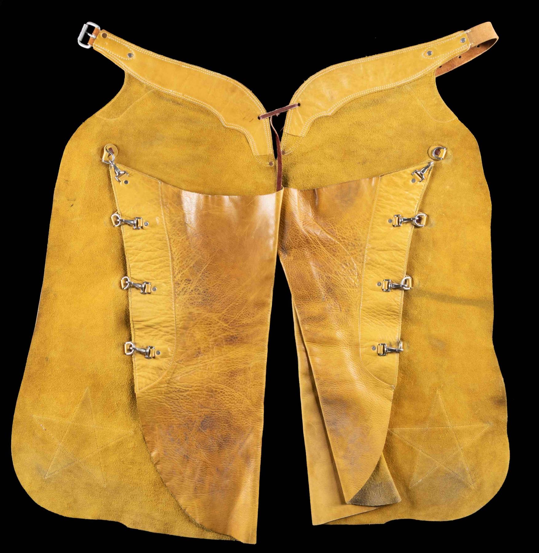 LEATHER CHAPS. Tan & brown leather chaps measures approx. 34" x 18" w/ plated conchos. CONDITION: very good overall showing light handling marks & stains. (02-25256/MD). NON-GUN. $300-500.
