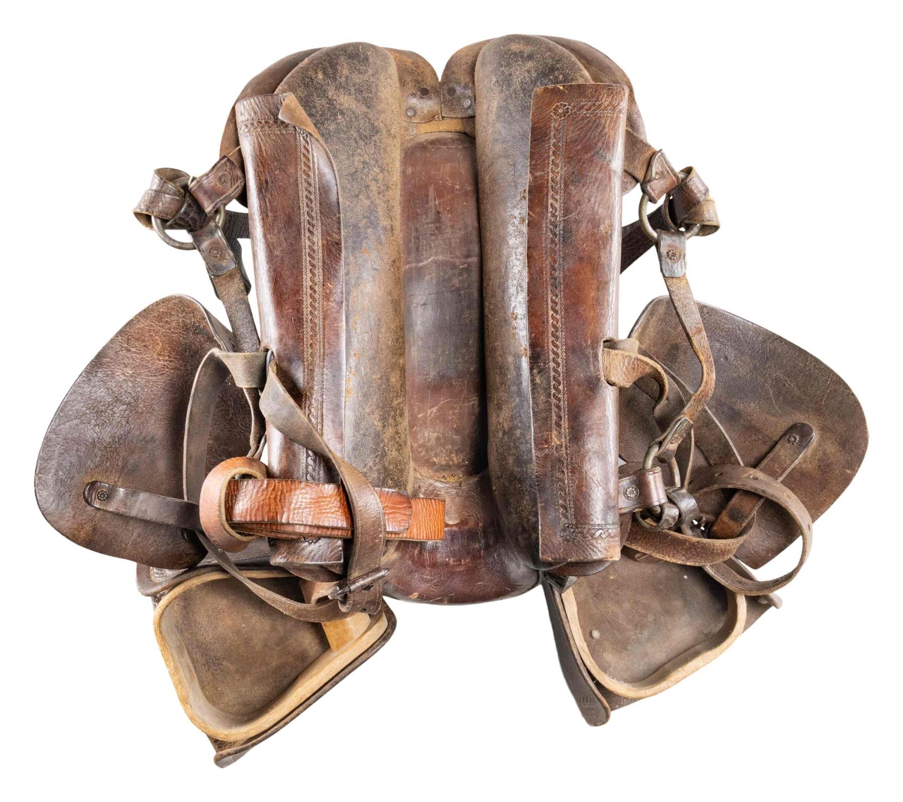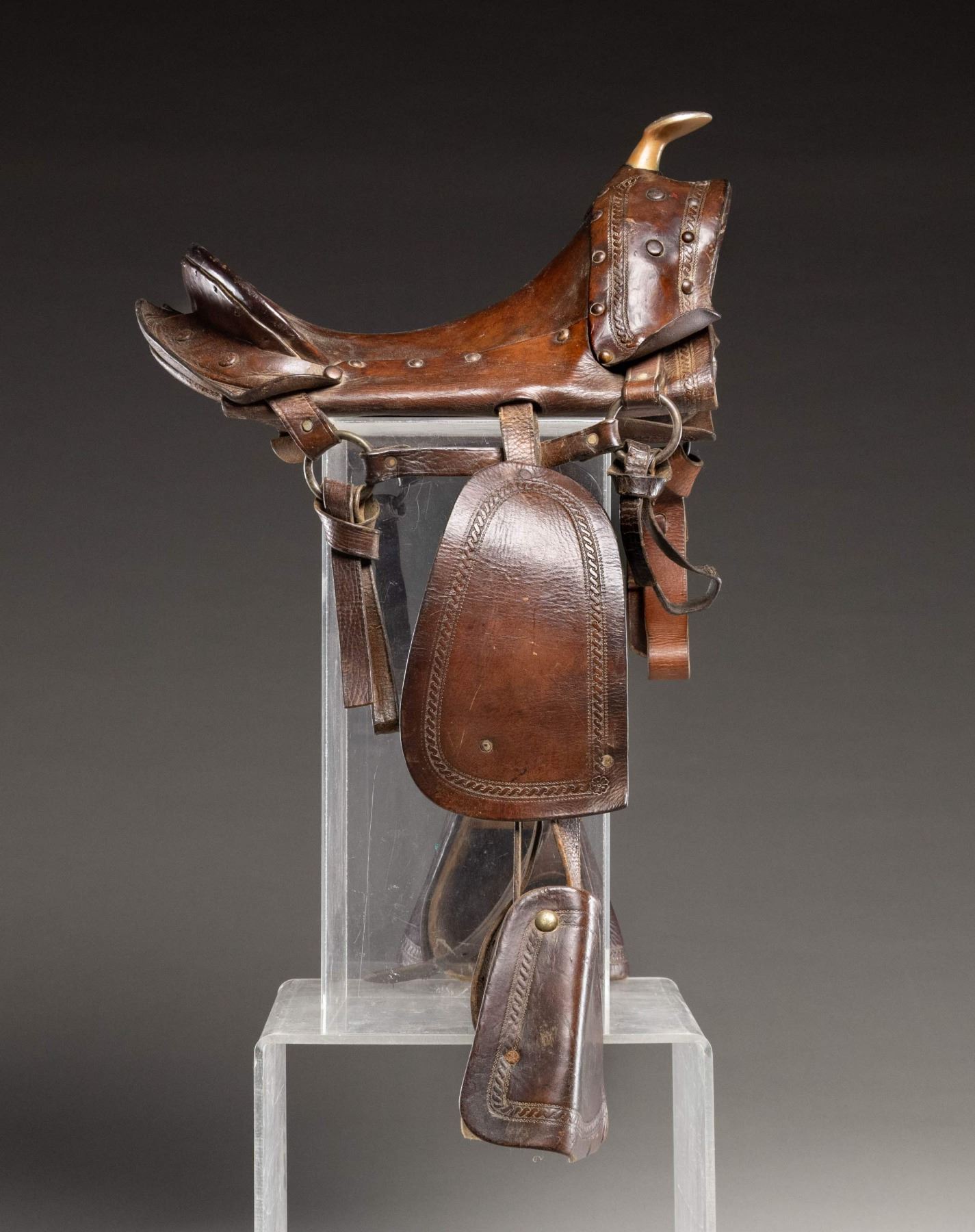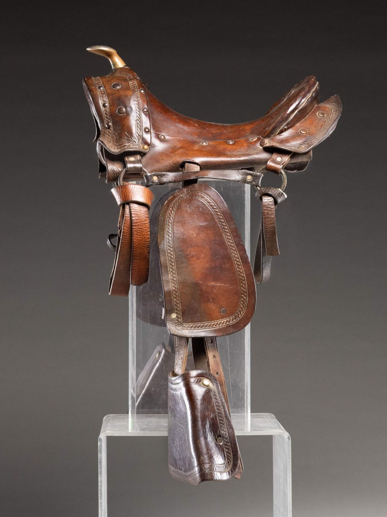 Saddle measures approx. 16" length made of brown embossed leather held into place by rivets. Horn appears to be brass with silver plating/ No visible maker's marks. Brown leather straps w/ wooden stirrups. CONDITION: saddle has good appearance showing wear, scuffs & cracking leather. Stirrups appears solid with scuffs. (02-25263/MD). NON-GUN. $350-550.