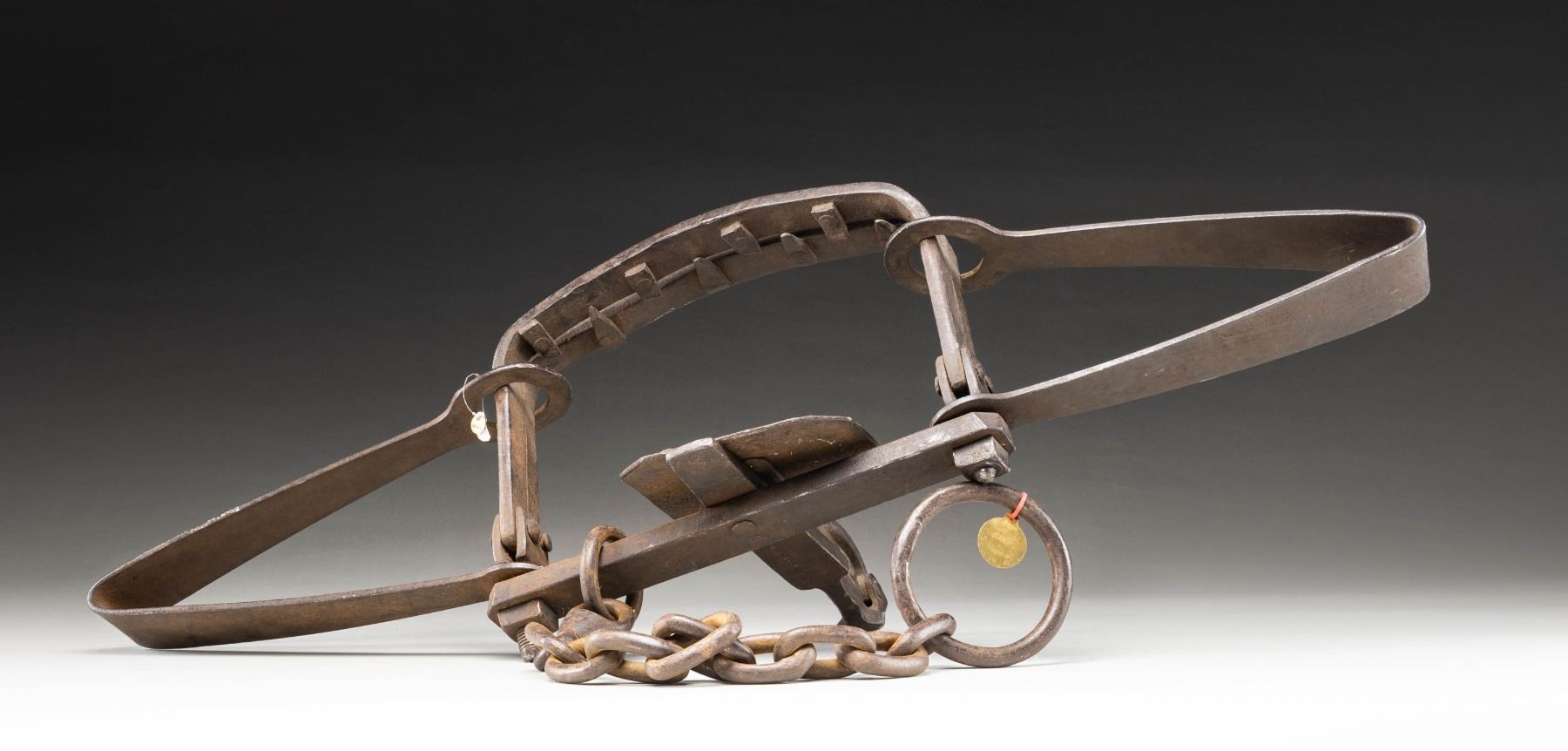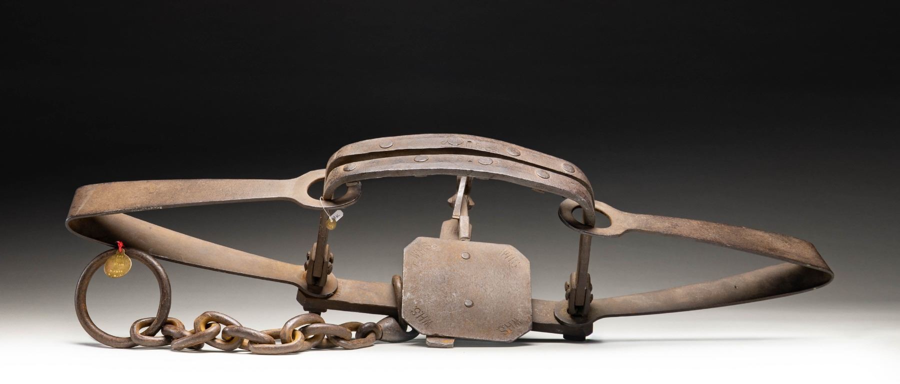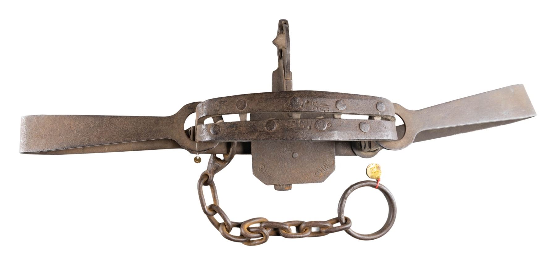 Measures approx. 38" wide & 10.5" tall. Chain measures 18" long. throughout the trap is "W.H.S." stamps. CONDITION: trap shows oxidation, but appears intact. (02-25267/MD). NON-GUN. $500-800.