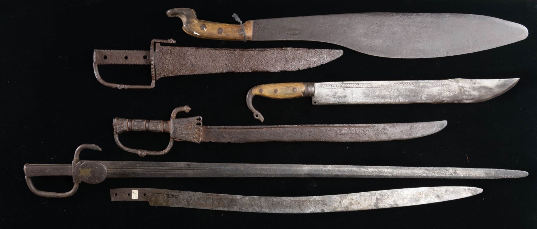 WEAPONS. Well patinaed group of Mexican edged weapons, espada anchas have been made same way for 200 years, the 3 in this group are each unique in design. There is presentation sword blade by premier Mexican cutler "Aragon" to "Coronel Prisciliano M. Benites". There are also 2 horn gripped bolo/machetes, the larger is maker marked. CONDITION: good to very good overall, iron patina, one espada ancha has no grip. PROVENANCE: Estate Collection of Compton LaBauve Jr. (02-26467-1/JS). NON-GUN. $800-1,200.