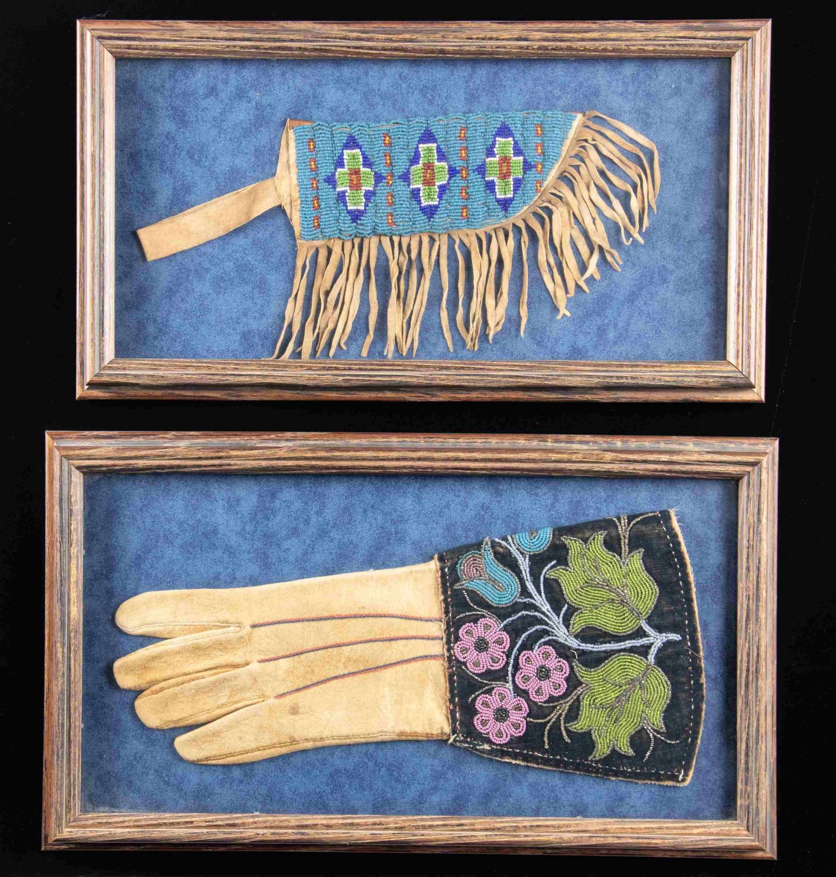 SHEATH. 1) Great Lakes style thread sewn beaded floral design on 5" x 6" cuff on black cloth panel. 2) 7" x 3" knife sheath decorated dark blue, green, yellow, & white-heart red sinew sewn beads on sky blue ground. CONDITION: both items appear very good, but were not unframed. (02-25893/JS). NON-GUN. $500-800.