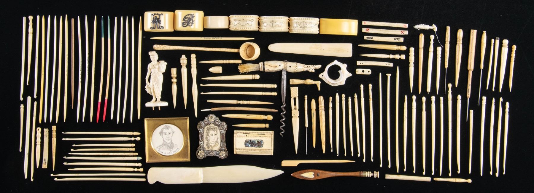 Lot includes carved ladle, napkin rings, crochet hooks, cork-screw handle in shape of "lady's leg", 2 portraits in brass frames, 2.5" hinged case with abalone inset, fids, knife, 3.5" Asian lady figure. CONDITION: good overall. (02-25557/JS). NON-GUN. $500-800.