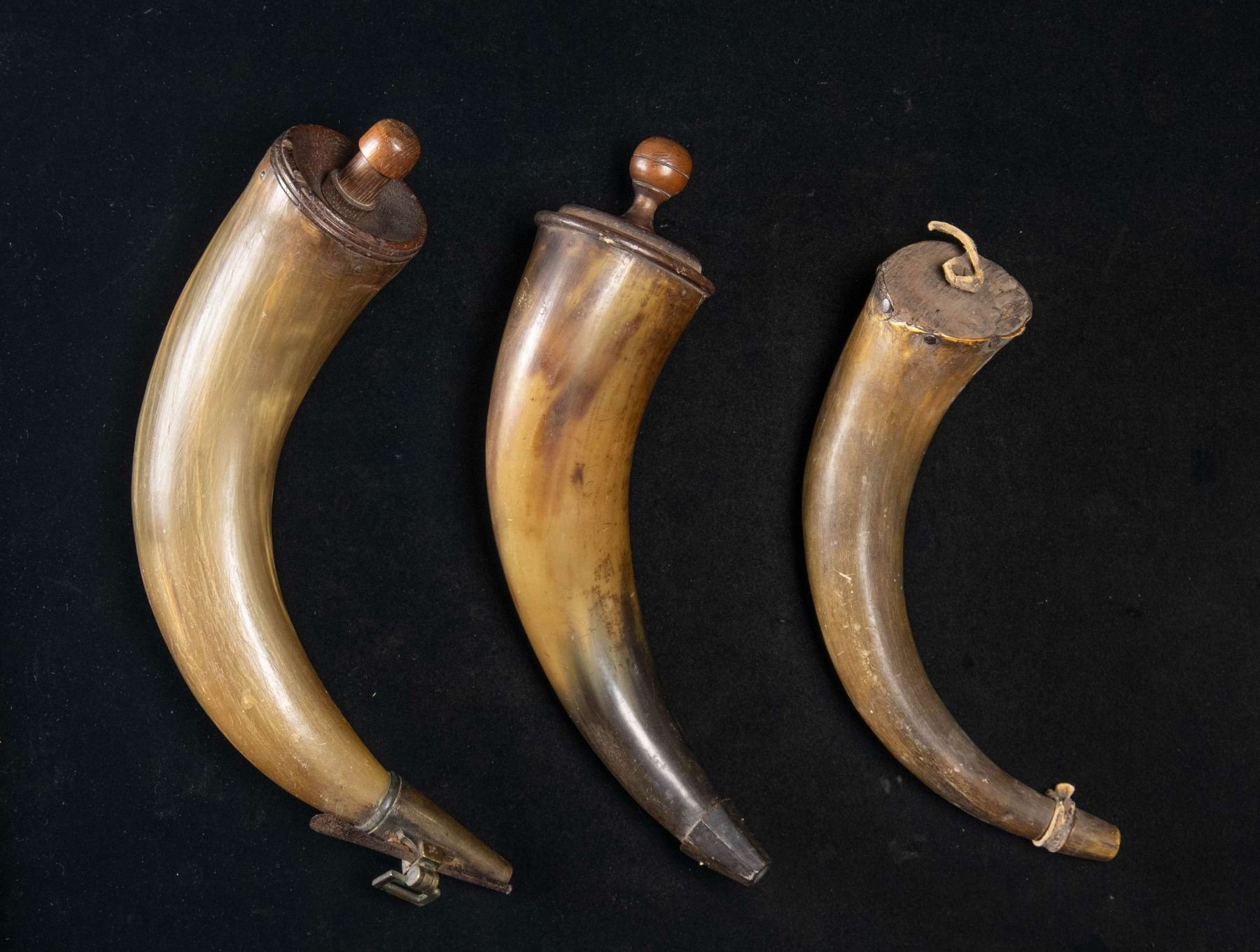 Largest is 12" cannon priming horn with 18th century style wrought iron & cast brass measure missing broken iron closure tip. Other 2 horns 10"; one with turned wood base with screwed in turned wood plug. CONDITION: good to very good overall, small insect damage to one. (02-26090/JS). NON-GUN. $300-400.