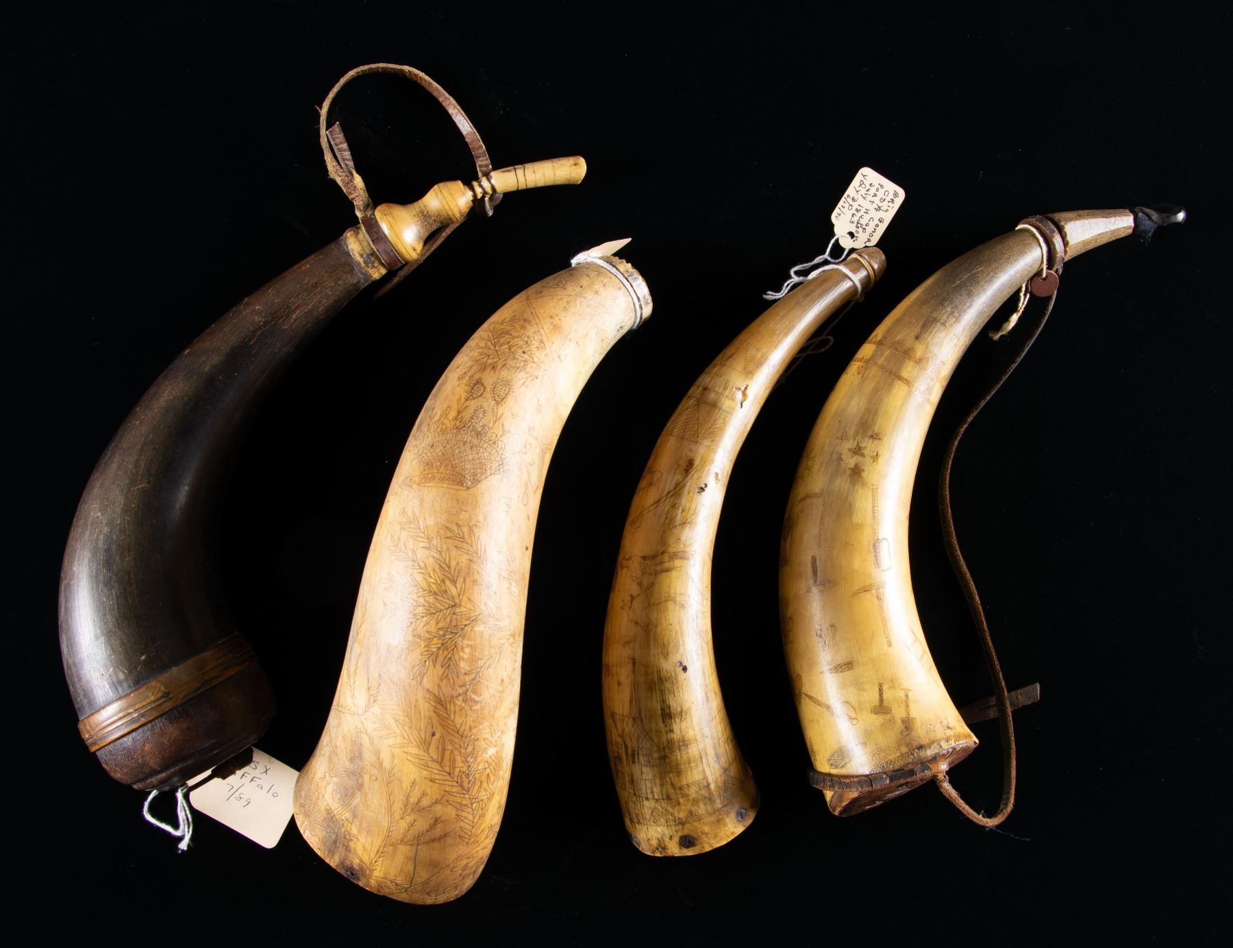 Lot 3453 FOUR SCRIMSHAWED POWDER HORNS.