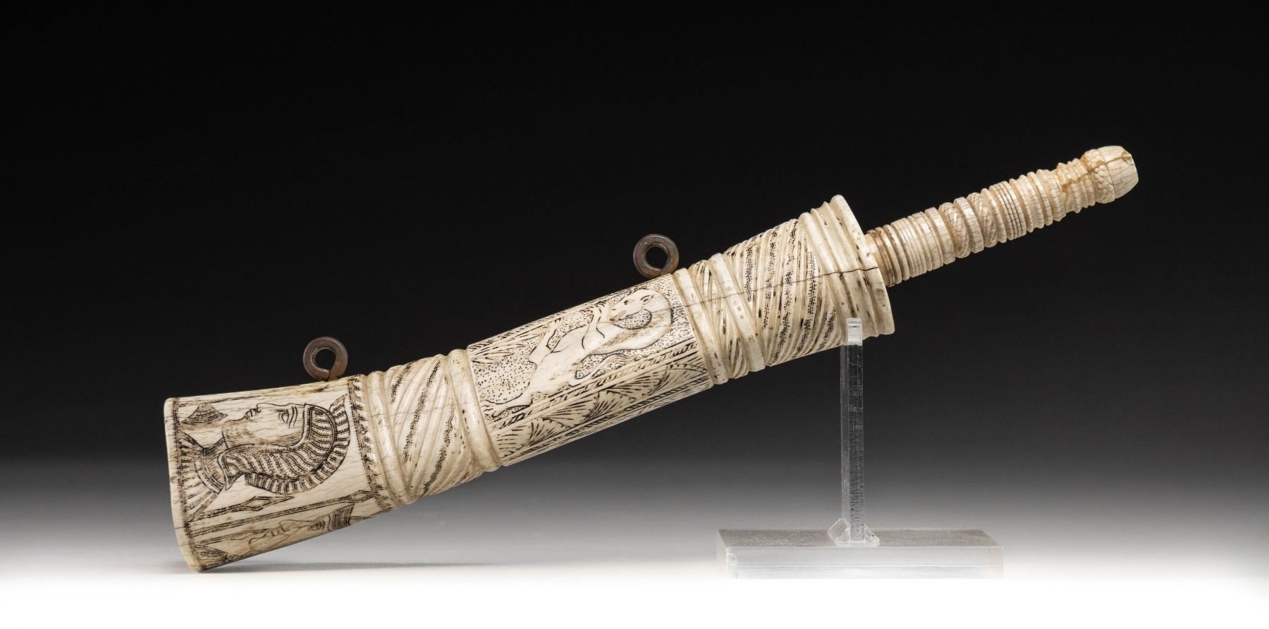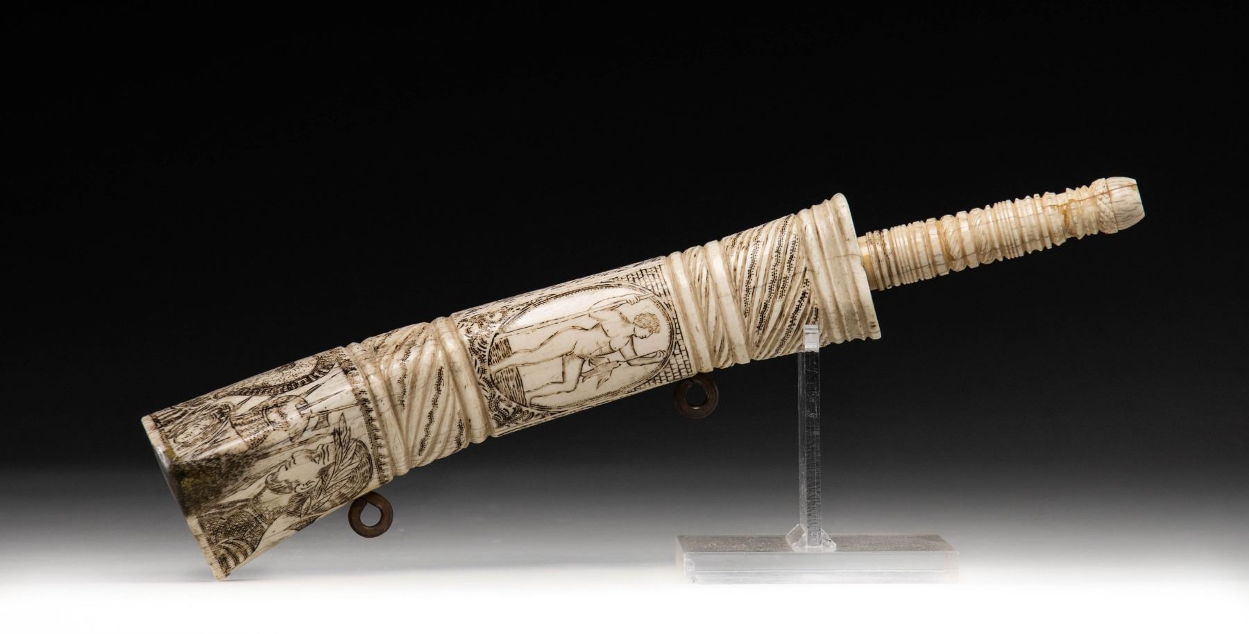Mediterranean white bone powder flask. Flask measures 14 3/4" from top to bottom. IT features various designs that appear to be Ancient Greek & the flask appears to be 19th century made. CONDITION: flash shows a couple old cracks, some staining & age related war. (02-25347/MJC). $400-600.
