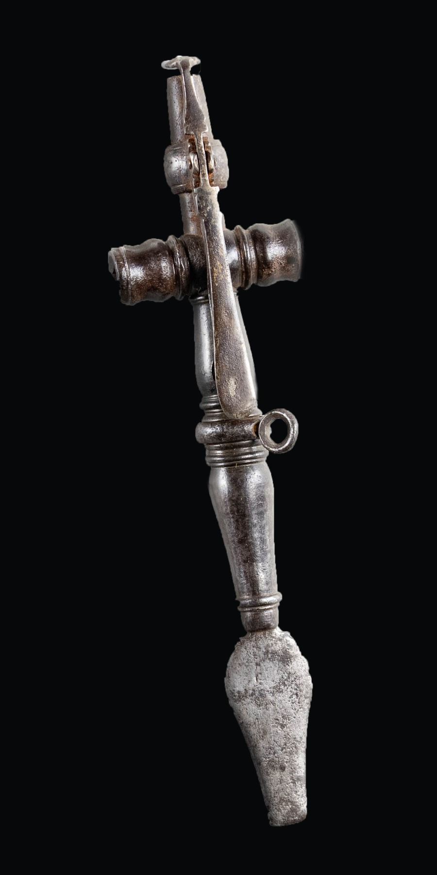 Combo wheellock tool with priming tool, powder measure & spanner. 7 1/2" overall length. CONDITION: metal is an overall gray patina with oxidation & some light pitting. (02-25351/MJC). $400-600.