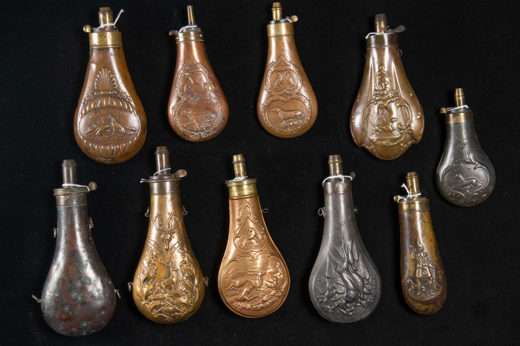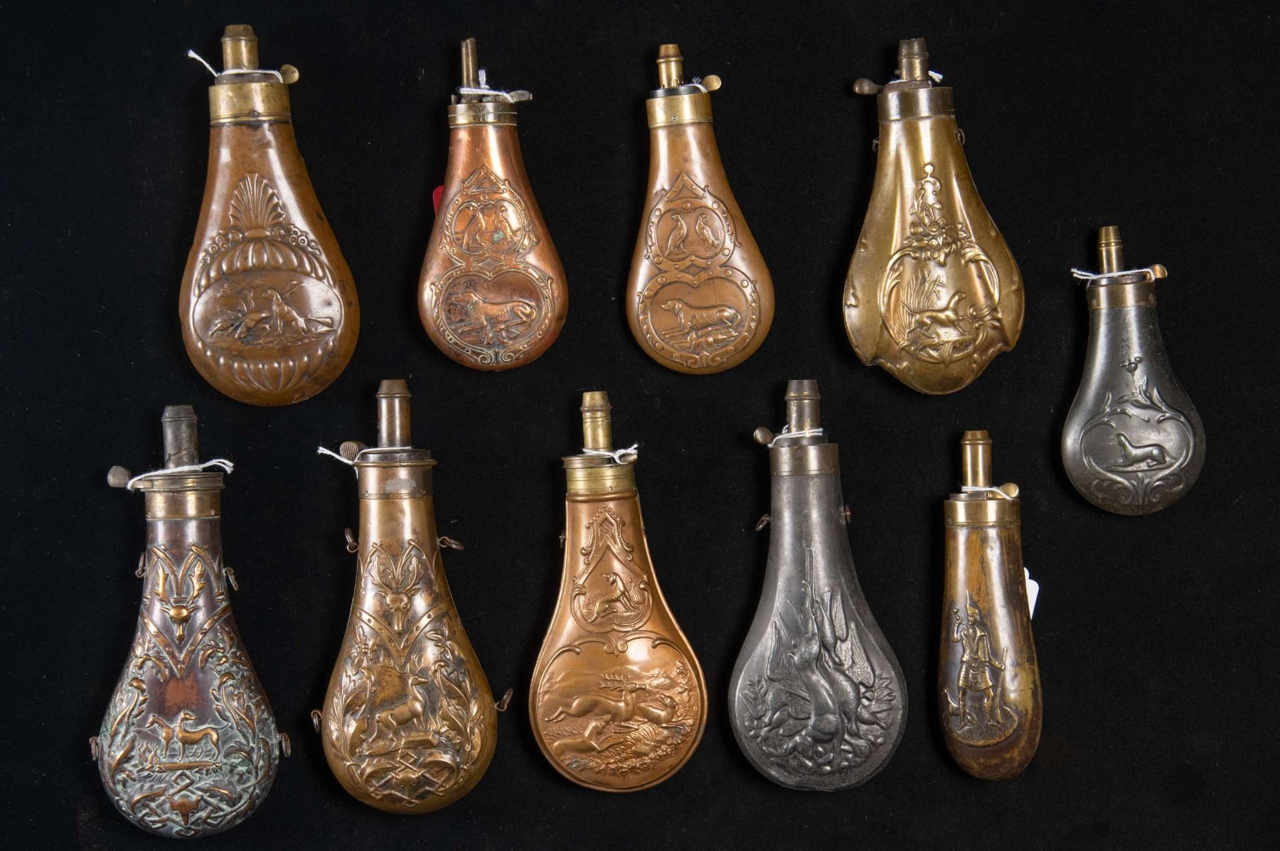 Lot 3467 TEN DECORATED HUNTING POWDER FLASKS.