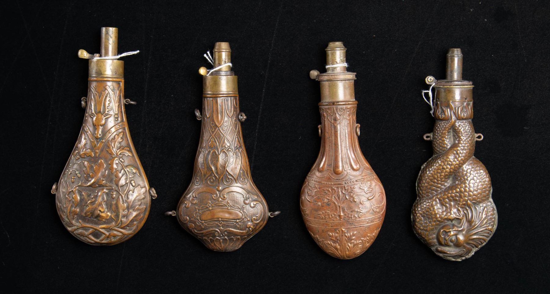 Lot 3470 FOUR LARGE DECORATED POWDER FLASKS.