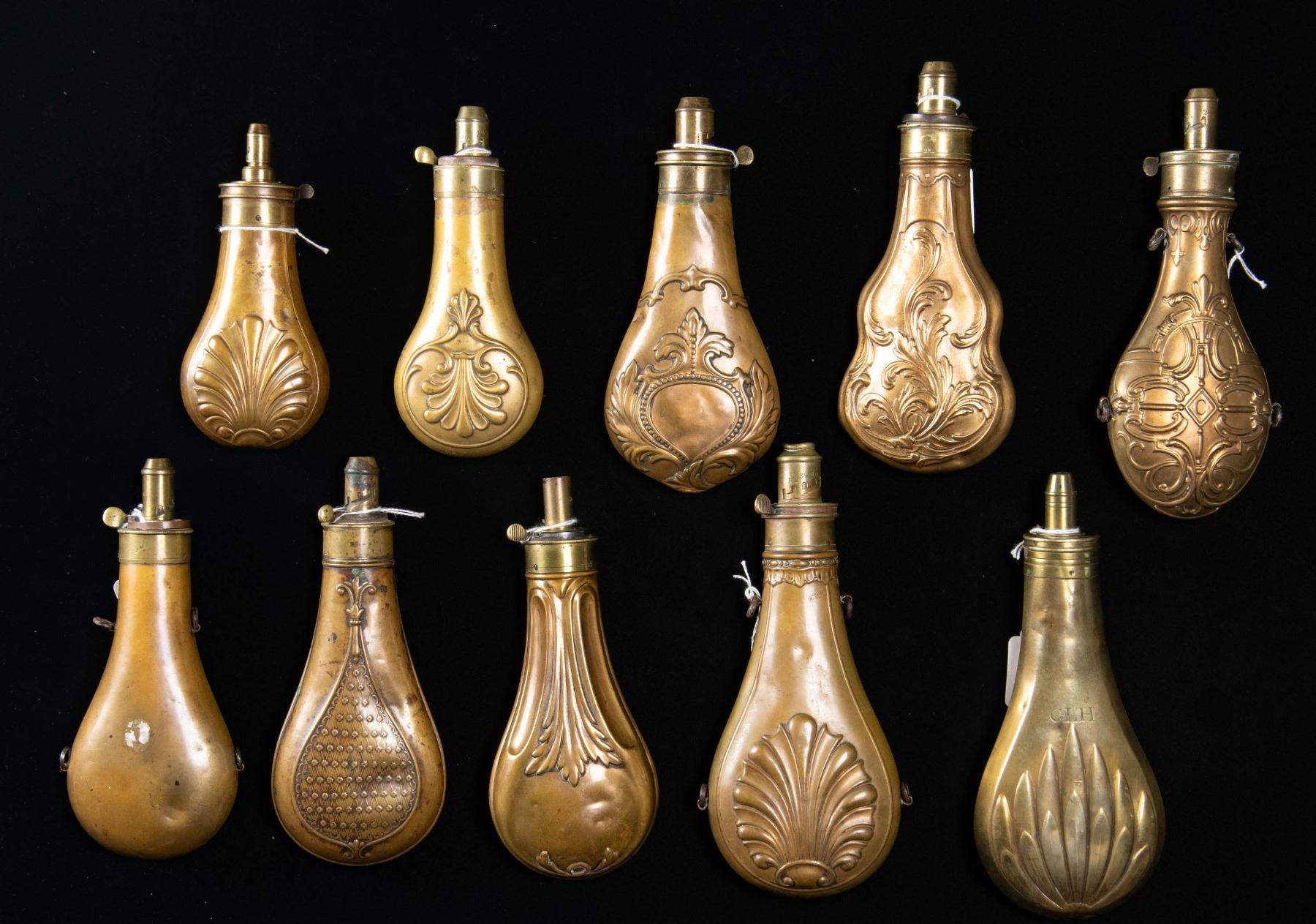 Lot 3471 TEN DECORATED HUNTING POWDER FLASKS.