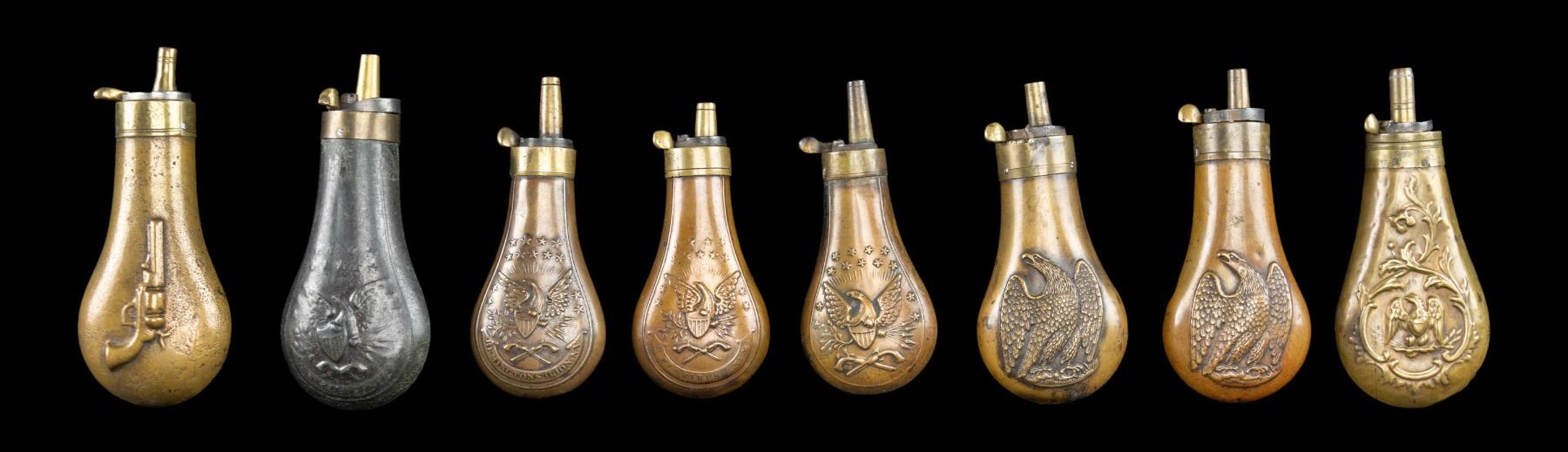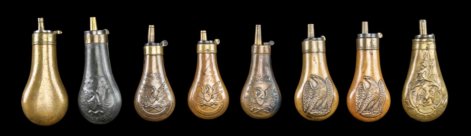 Lot 3476 8 PISTOL POWDER FLASKS.