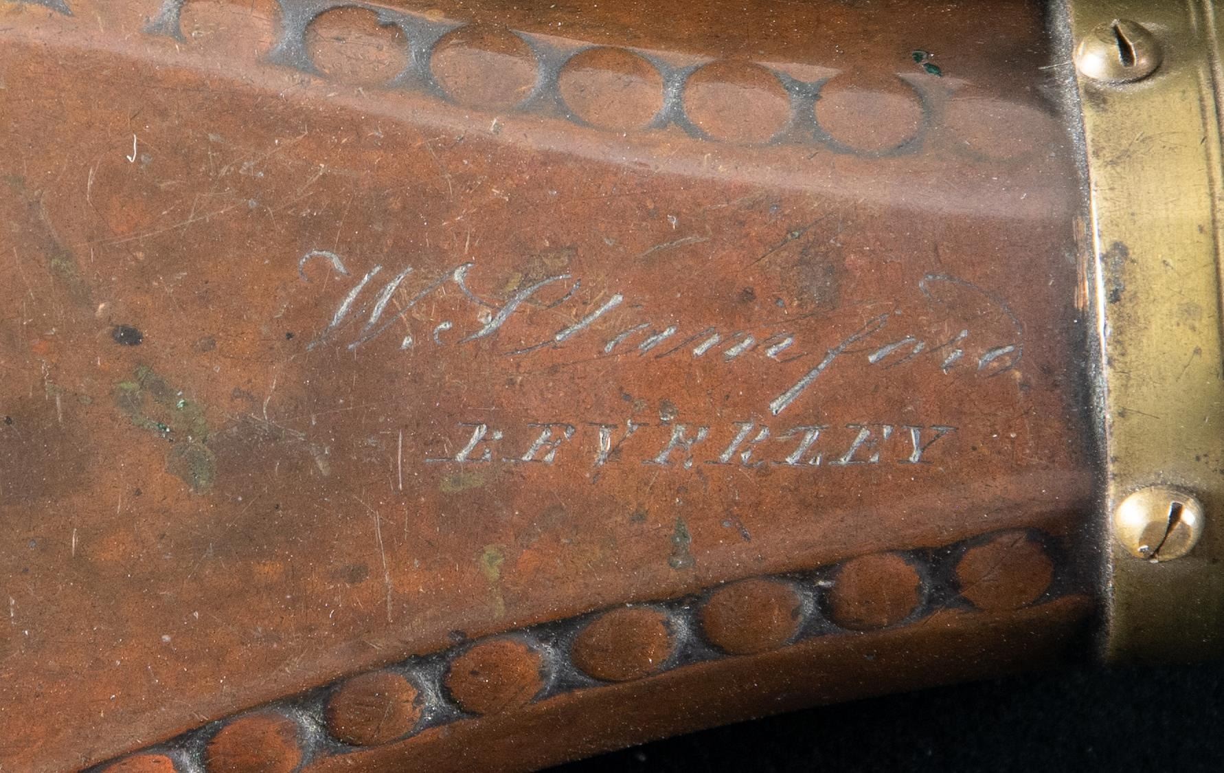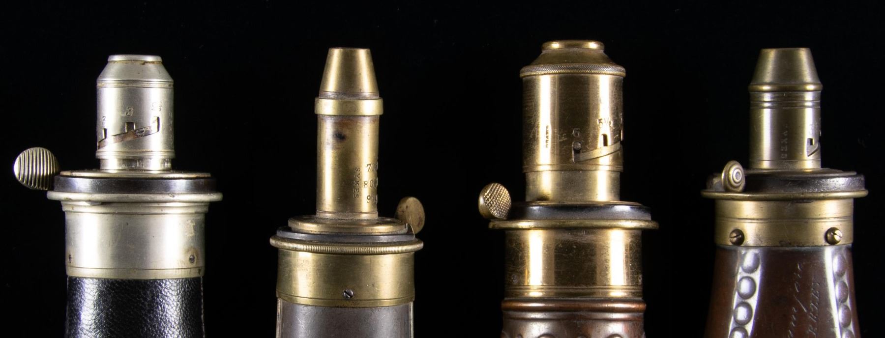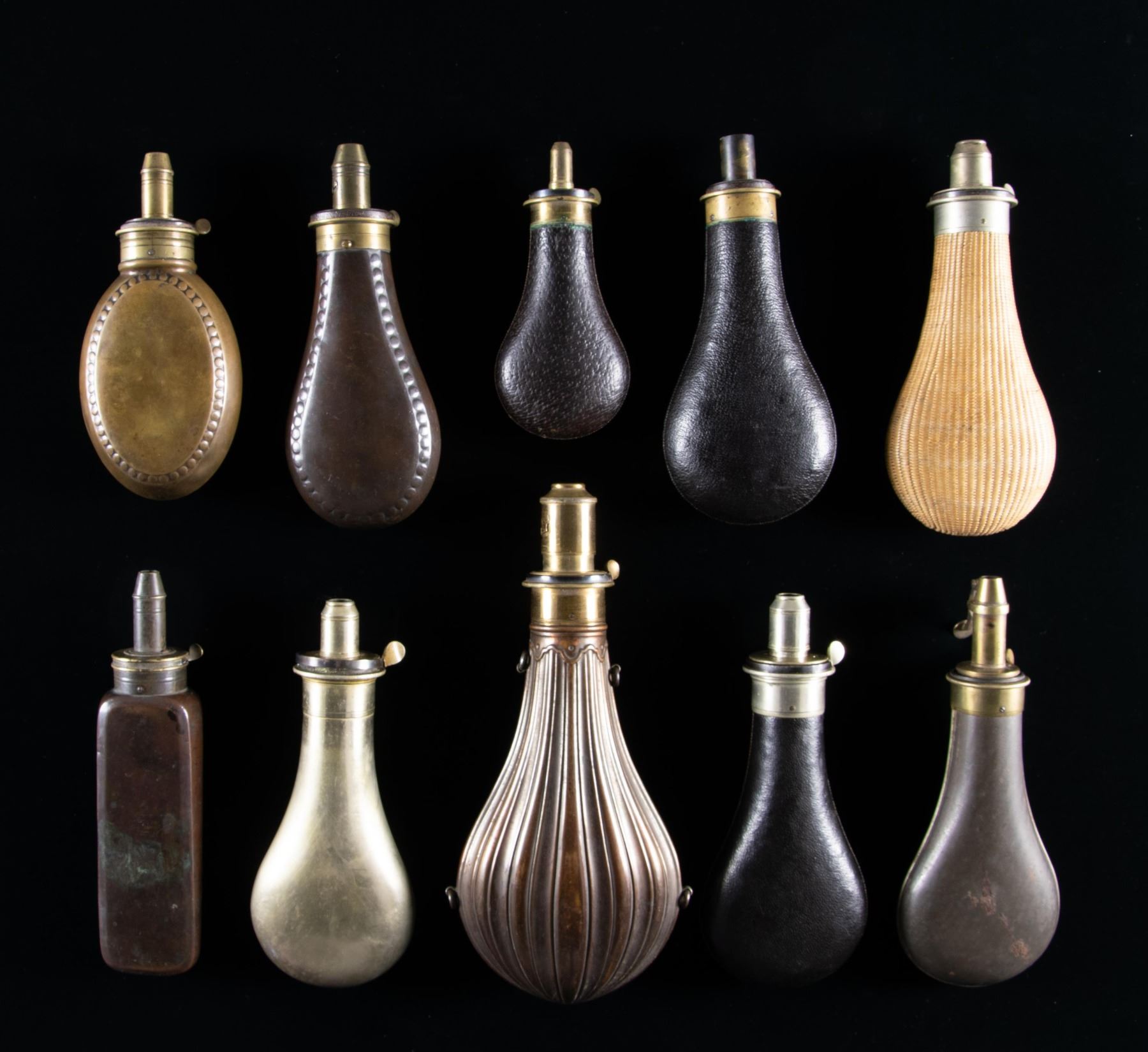 Thomas Sykes and family are among the earliest powder flask manufacturers in Sheffield. Several rarely seen varieties of "Syke's Patent" rifle & shotgun flasks: three 6", 7", 8" leather covered, 8" German silver, 8" wicker covered, 10" fluted, 6" oval, 8" rectangular, 8" tin flask with patent measure, and name inscribed 7.5". CONDITION: good to very good overall. PROVENANCE: The Esteemed Norm Greenberg Collection. (02-24848-3/JS). NON-GUN. $700-900.