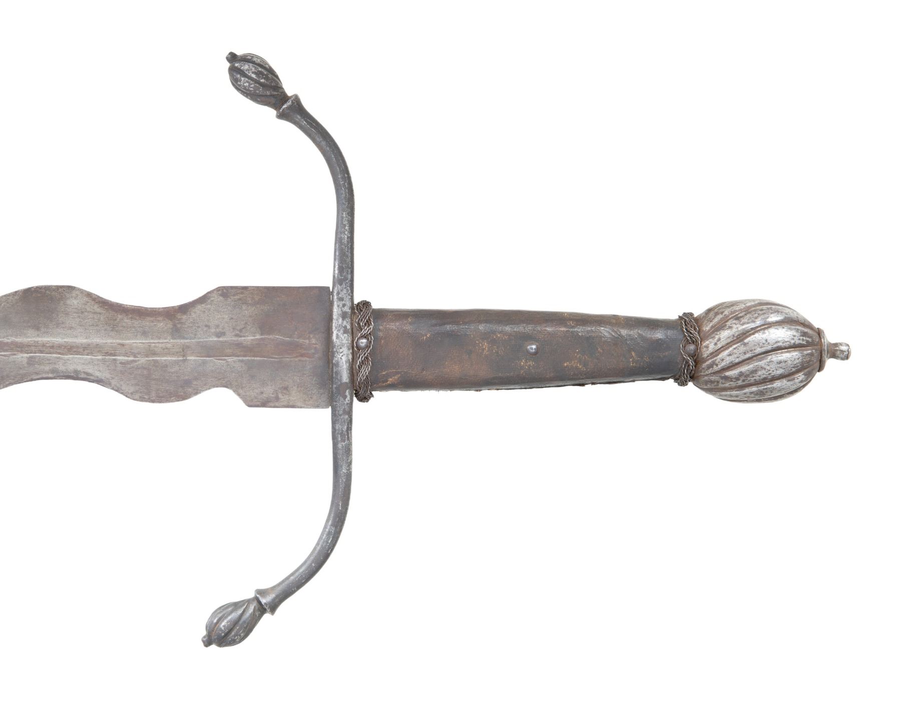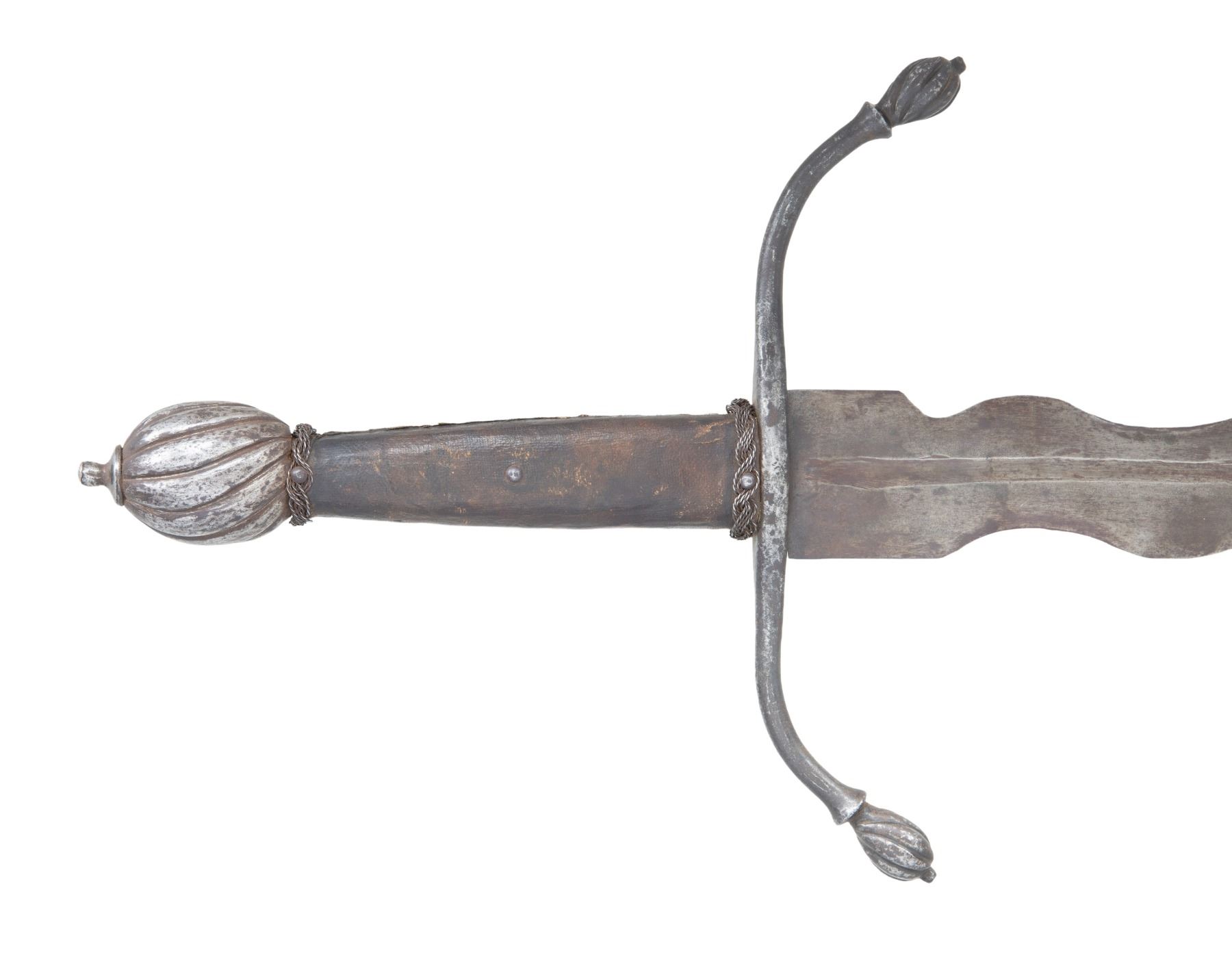 A well made early style German flamberge broadsword likely produced during the in the mid-19th century following a pattern from the 12th century. The sword measures 42 3/4" overall with a 34" double edged undulating blade. The down turned cross guard is 10" long and has twisted melon terminals. Leather covered wooden grip with Turk's head knots above and below. Large twisted melon pommel. CONDITION: light wear overall with wear and good patina on the hilt. PROVENANCE: Estate Collection of Nicholas Apergis. (02-24730/BF). NON-GUN. $500-800.