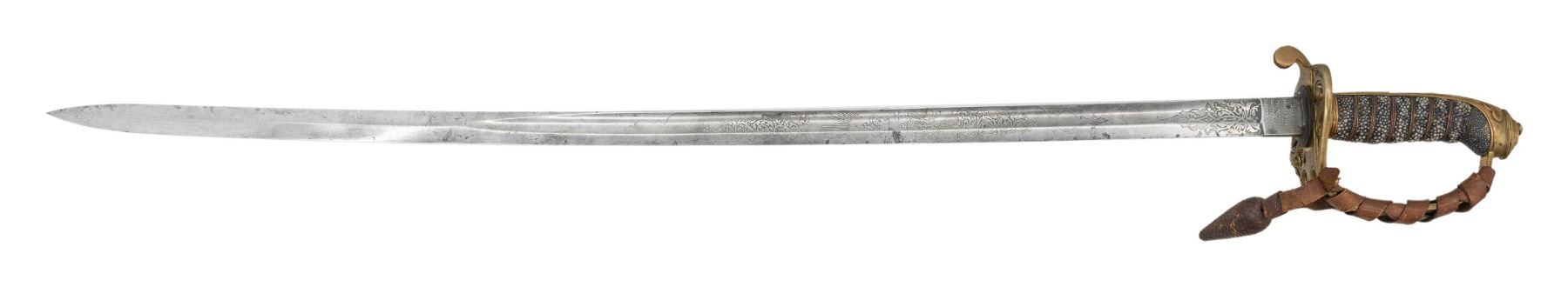 A good British volunteer rifles of the M1822 form measuring 39 1/4" overall with an etched blade that shows foliate motifs, crowned VR, crowned horn, and "RIFLE VOLUNTEERS". The blade's ricasso is marked "ROB. MOLE & SONS Birmingham Makers to the WAR & INDIA OFFICES". Gilded brass 5 branch hilt with a crowned VR in the pierced guard. Wire wrapped shark skin grip with a leather sword knot. No scabbard. CONDITION: blade has a light gray patina with some minor spotting. Hilt shows traces of the original gilded finish. Grip solid. Knot complete. PROVENANCE: From the PMRB Collection. (02-25854/BF). NON-GUN. $300-500.