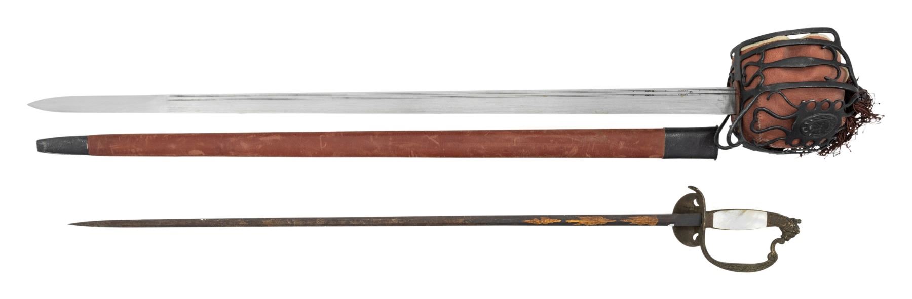 1) A reproduction of a European basket hilt backsword of the second half of the 18th century measuring 40 1/2" in length. Plain blade with 2 narrow fullers. The basket hilt has 2 oval grotesque masks embellishing the guard. The inside of the guard is fitted with fine red leather and a cloth tassel. The matching red leather scabbard has iron mounts. CONDITION: very light wear overall. 2) Scarce circa 1830 Bavarian court sword measuring 36 1/2" overall with gold highlighted etching on the blade. Gilded brass hilt with a lion on the downturned guard and a lion head pommel. Ornate knuckle bow with a crowned star on the front mother-of-pearl grip. No scabbard. CONDITION: blade has a dark patina. Only a trace of gilded finish remains on the hilt. Hilt is a bit loose. Grips are solid with no damage. (02-25310/BF). NON-GUN. $300-450.