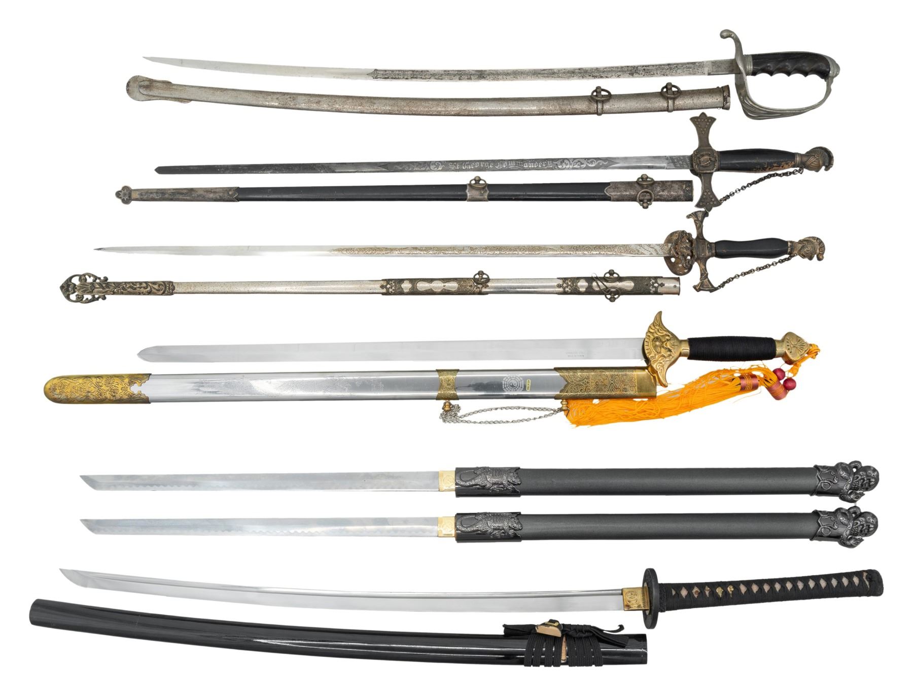 Lot 3514 3 FANTASY, 2 FRATERNAL, & US M1902 SWORDS.
