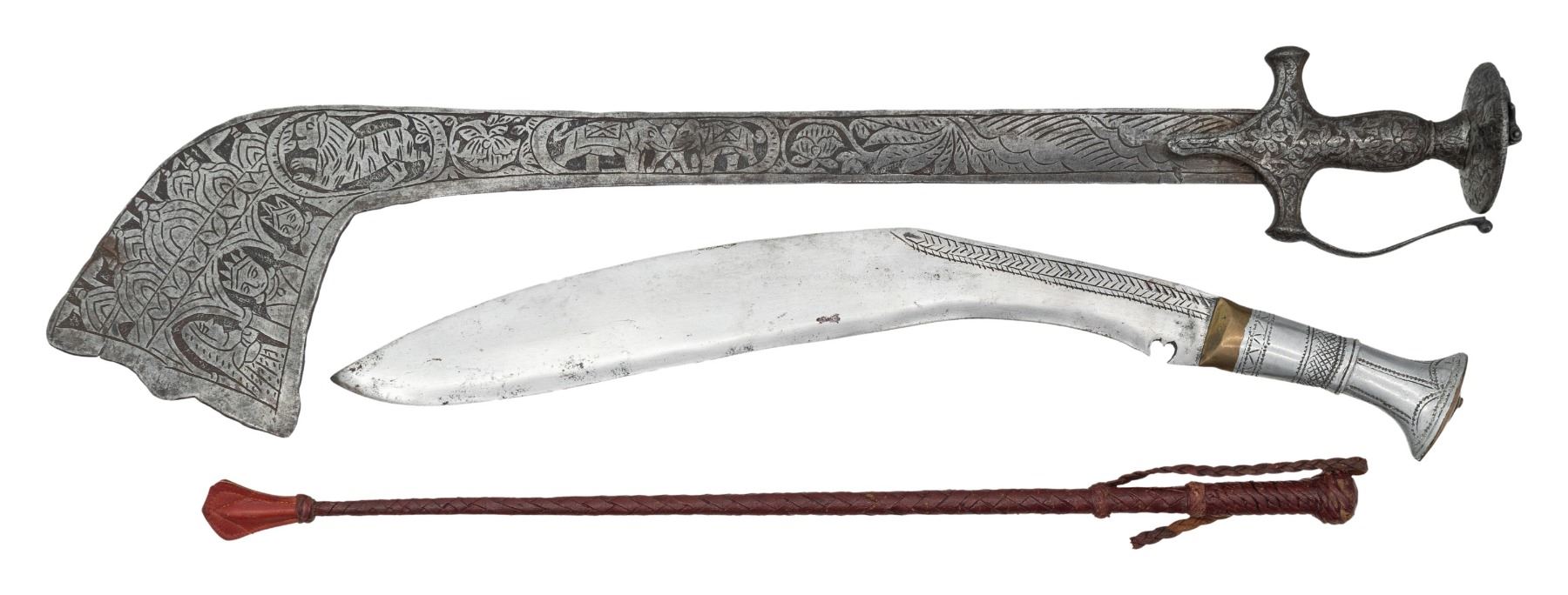 Lot 3525 TOURIST STYLE KUKRI, RIDING GROP & KORA SWORD.
