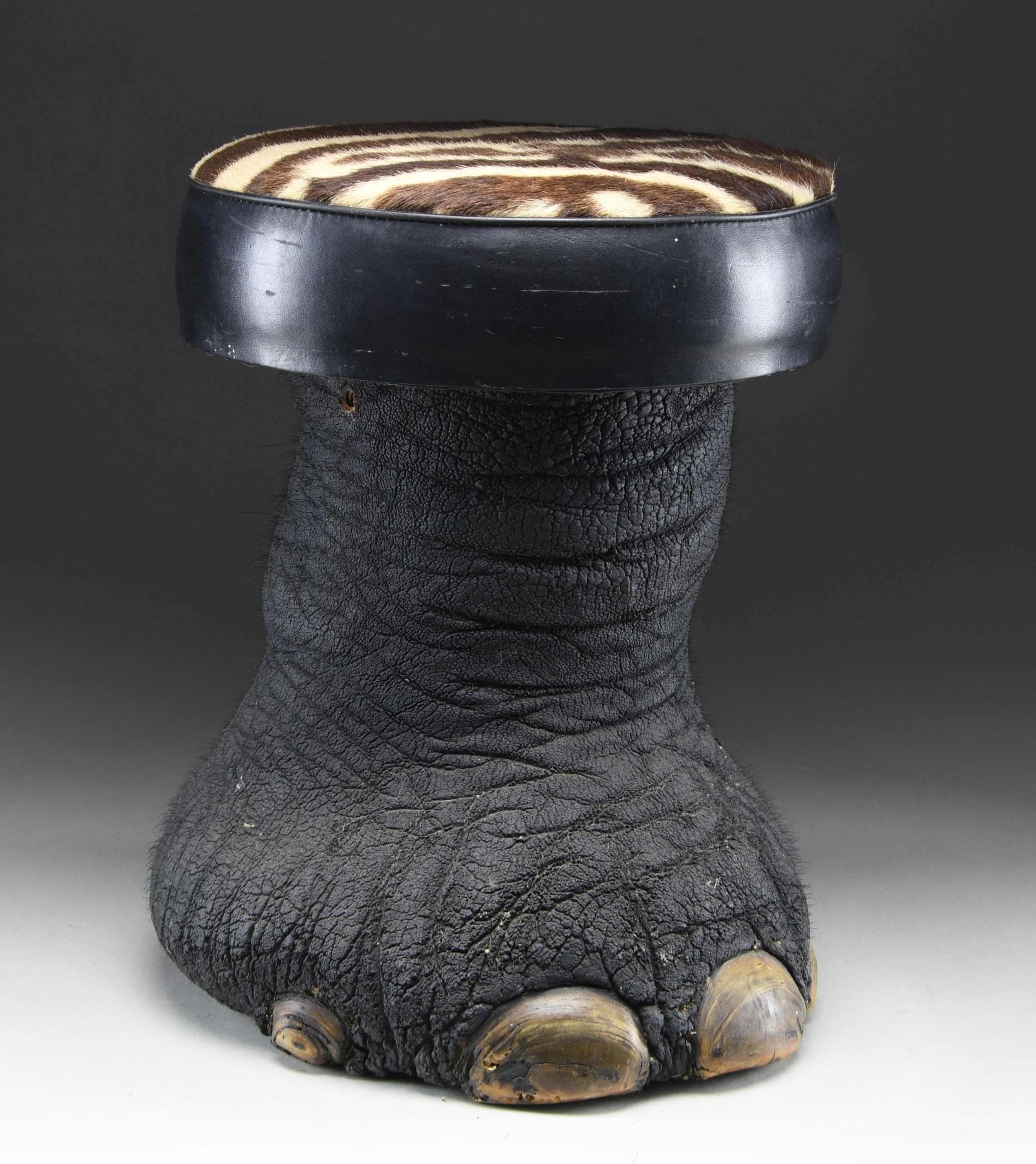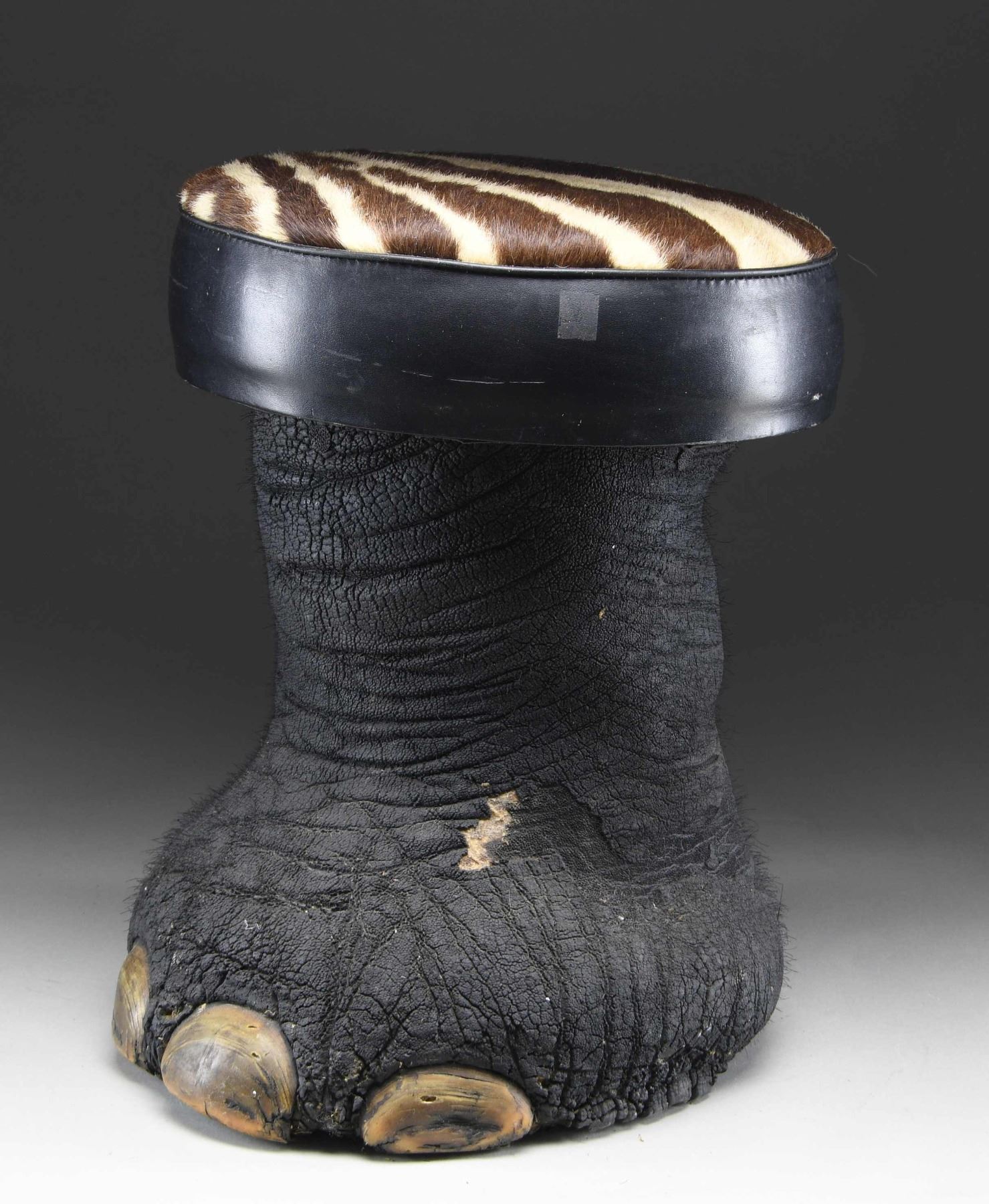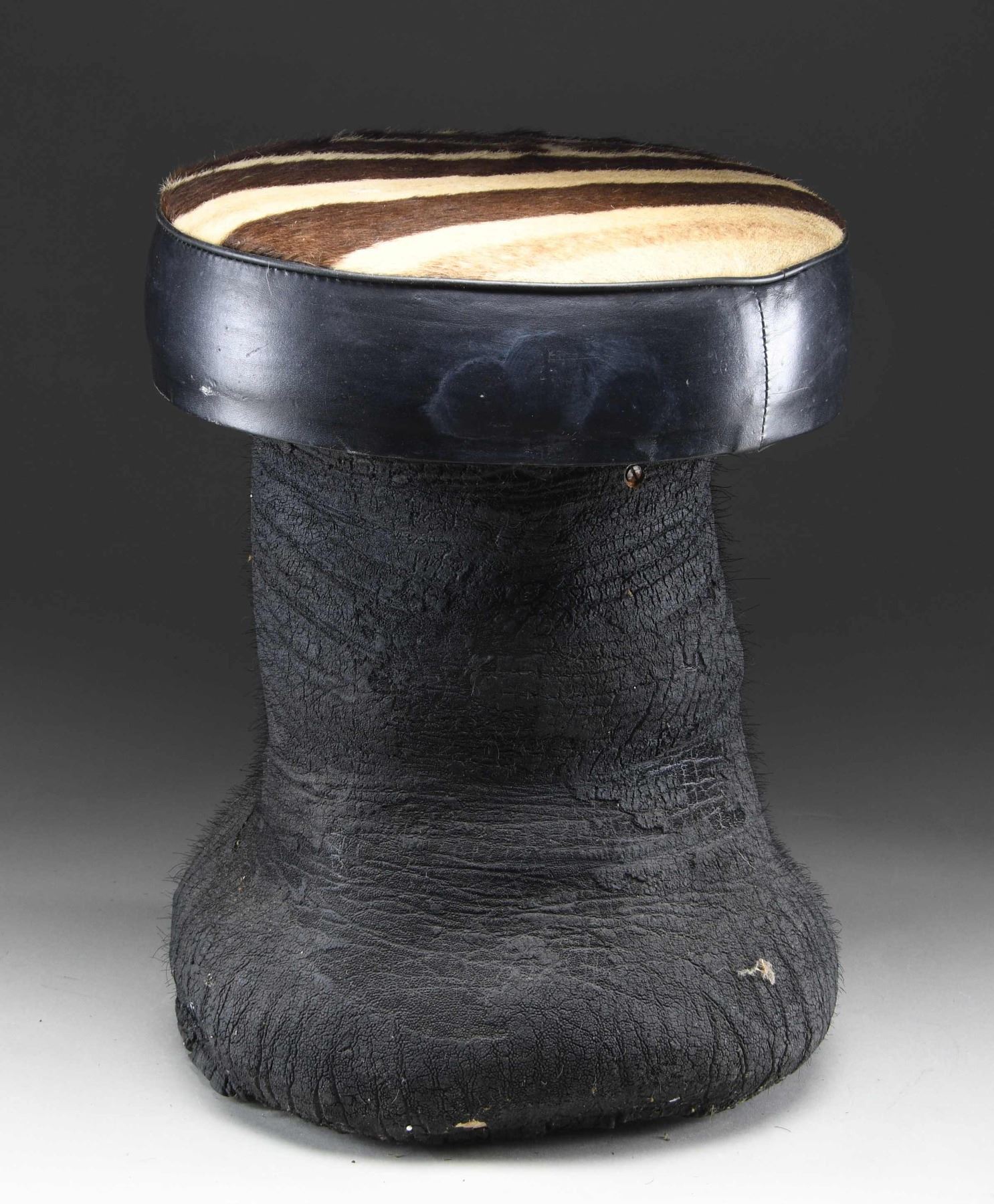 SITTING STOOL. This elephant foot has been made into a sitting stool or foot stool by local craftsmen in India. This example measures approximately 19" in height and approximately 14" in width at the seat. The seat measures approximately 4 1/2" in thickness and 46" in circumference, with the top covered in brown and white striped animal hide. The seat is edged in black leather and the foot itself is painted/dyed black. CONDITION: stool shows handling wear only, with very minor losses to the body of the foot. PROVENANCE: from the renowned collection of quality sporting arms from Lewis Drake together with inventory of Lewis Drake Associates. (02-25901/BF). $300-500.