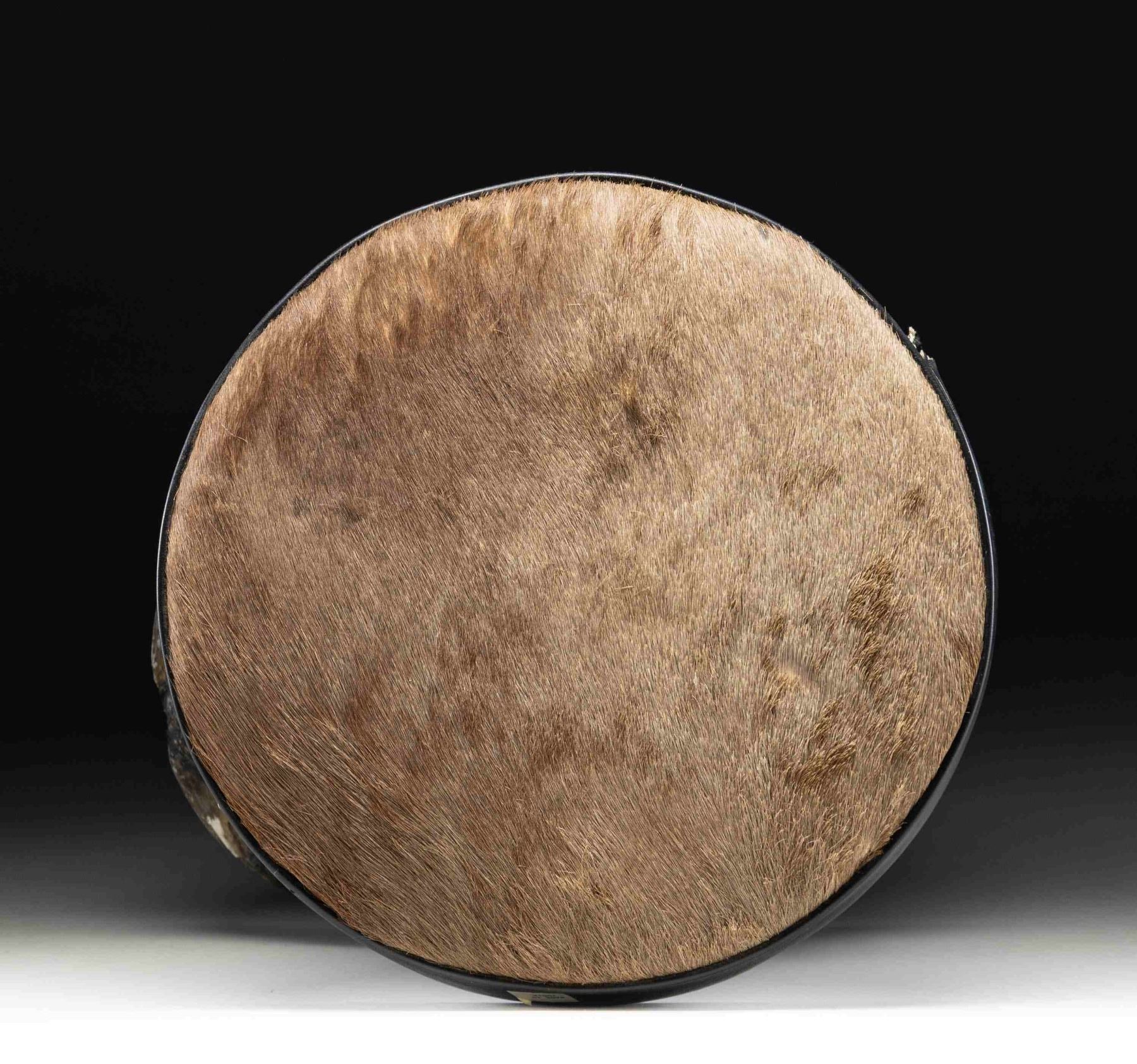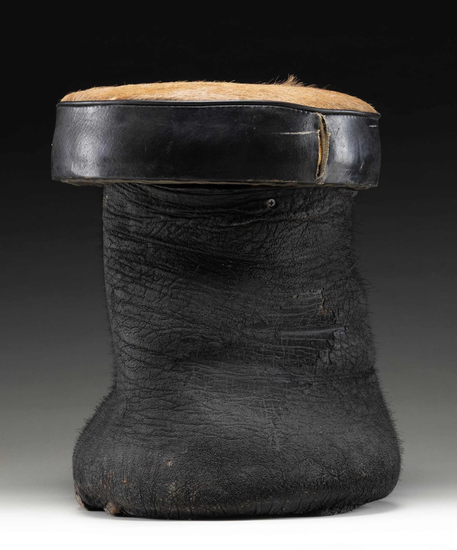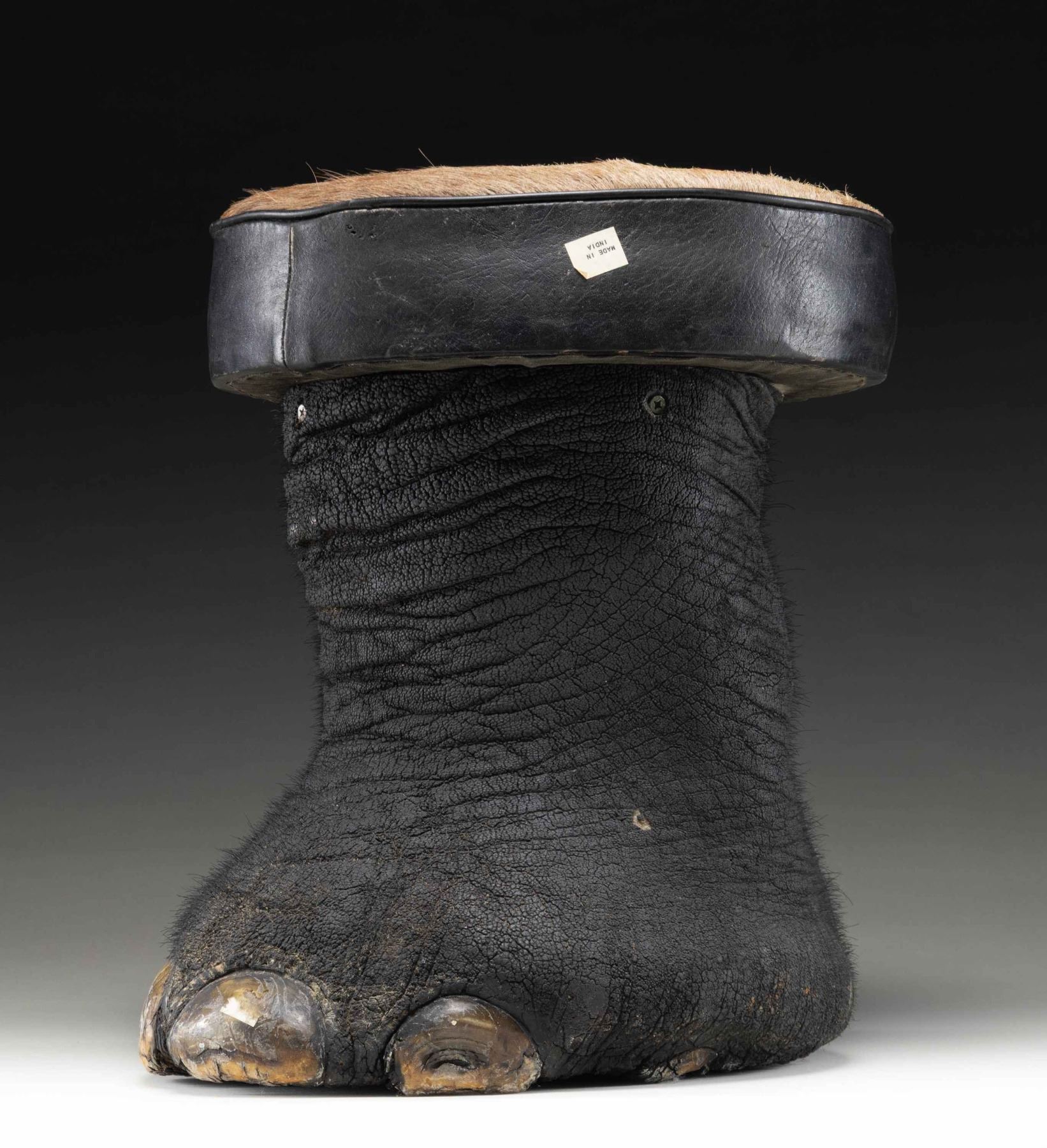 This elephant foot has been made into a sitting stool or foot stool by local craftsmen in India. This example measures approximately 17" in height and approximately 14" in width at the seat. The seat measures approximately 4" in thickness and 41.5" in circumference, with the top covered in brown animal hide. The seat is edged in black leather and the foot itself is painted/dyed black. CONDITION: stool has good appearance with handling wear. PROVENANCE: from the renowned collection of quality sporting arms from Lewis Drake together with inventory of Lewis Drake Associates. (02-25924-1/MD). NON-GUN. $300-500.