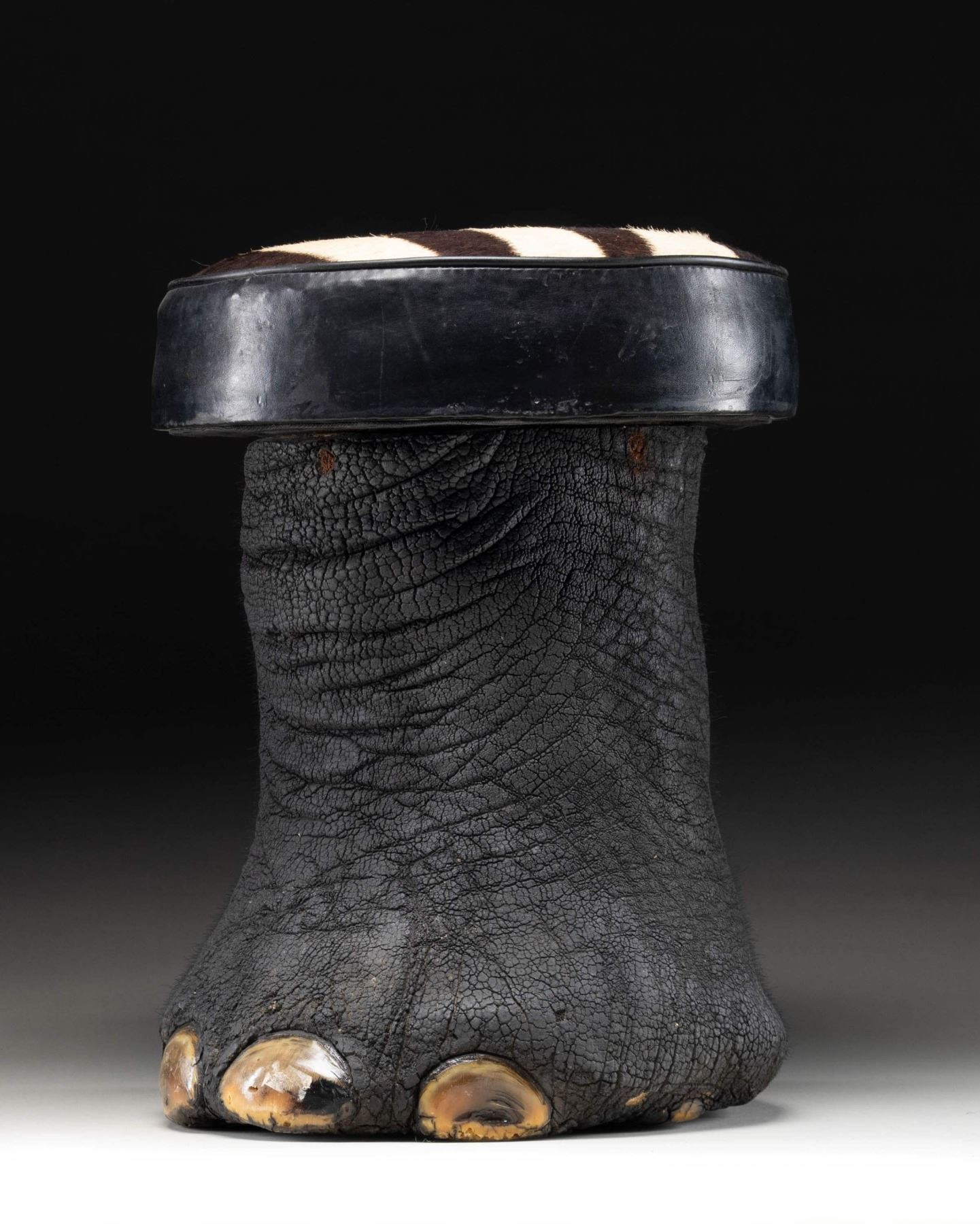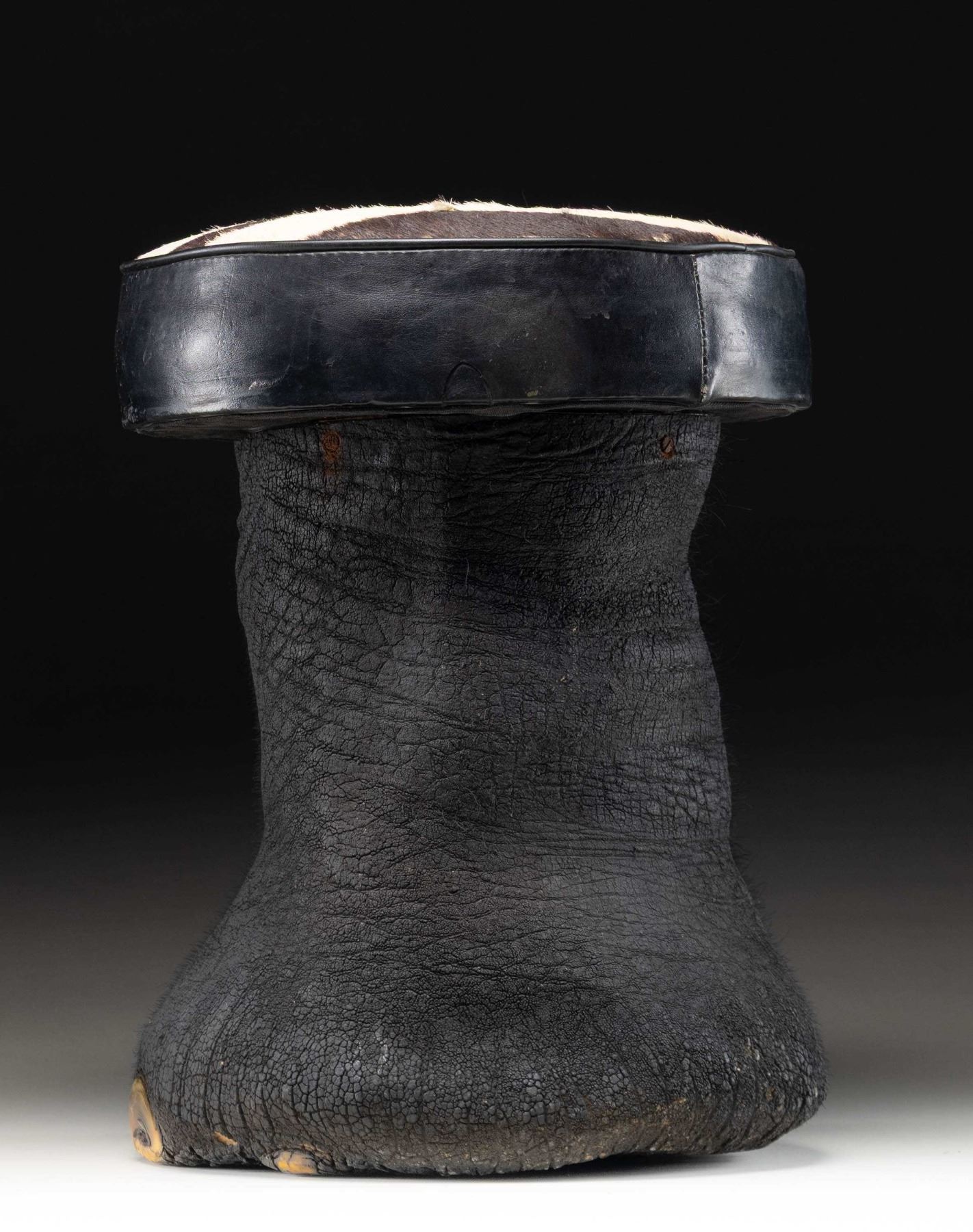This elephant foot has been made into a sitting stool or foot stool by local craftsmen in India. This example measures approximately 18" in height and approximately 13" in width at the seat. The seat measures approximately 4" in thickness and 40.5" in circumference, with the top covered in striped black & white animal hide. The seat is edged in black leather and the foot itself is painted/dyed black. CONDITION: stool has good appearance with handling wear & stitched cut in top hide. PROVENANCE: from the renowned collection of quality sporting arms from Lewis Drake together with inventory of Lewis Drake Associates. (02-25924-2/MD). NON-GUN. $300-500.