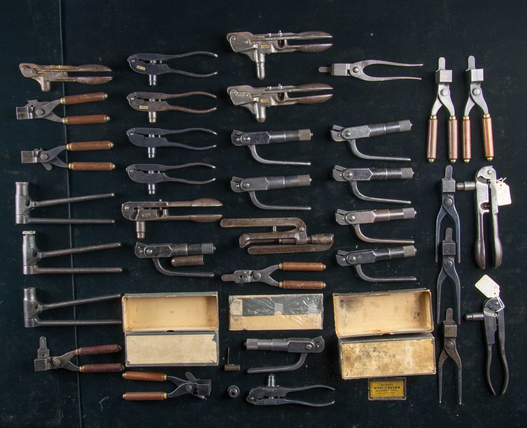 RELOADING TOOLS & BULLET MOLDS. 1) Three Winchester Model 1875 reloading tools; one is marked "45-75 W.C.F.", one marked "45. GOV."; each having worn finish turning gray, and one with remnants of its original gold colored finish is marked with what appears to be "44" but is illegible. 2) Winchester Model 1880 tools; A) 38 W.C.F. complete with decapping pin and bullet mold. Tool & mold appear unused, retaining a very large degree of original blue finish and are contained in an original box. The black box with its worn but legible white label with a patent date of Oct. 20, 1874. It is marked on the end "Adapted to Model 1873 & 1892 Repeating Rifles". B) 1st Model 1880 with spoon handles and Berdan decapper is marked "45.75 W.C.F.". C) 2nd issue marked "32-40". Patent date Sept 14, 1880. D) "45-75" with Berdan decapper and spoon handles. 3) Four 1882 reloading tools include 32 W.C.F., two 38 W.C.F. and a 44 Russ. 4) Model 1888; removable sizing chamber is marked "45-90 W.C.F.". Short live tool was designed especially for large cartridges. Decapping pin is not present. The screw ram has had its head modified to a thinner profile and fits loosely in the detachable sizing chamber. Tool is well worn turning gray and patina. 5) Three Model 1891 reloading tools. The three tools are all without the decapping arm. Calibers are 38-55, 40-82 and 45-90. The 45-90 tool has had its screw plug polished bright. 6) Eight Model 1894 tools. One with original factory box; black box with mostly legible white labeling. Tool is marked "38-72" and is complete with decapping pin and powder scoop. Tool retains a large degree of its original blue finish. Box has detached (but present) end label, broken corners and repaired tears. Remaining seven; three are marked "32-40", one marked "38-55", one marked "38-56", one marked "45-60", and one is marked "45 Gov". The decapping pins are not present in these tools. 7) Winchester bullet mold marked "44-W" over "BGI CO". Steel handles. 8) Winchester bullet mold with steel handles marked "38 W.C.F.". 9) Winchester bullet mold with threaded steel handles marked "38-55". 10) Winchester bullet mold with steel handle marked "38 W.C.F.". 11) Winchester bullet mold with wooden handles marked "32 W.C.F.". 12) Winchester bullet mold with wooden handles marked "38-55". 13) Winchester bullet mold with wooden handles marked "38-56". 14) Winchester bullet mold with wooden handles marked "44 Russ.". 15) Winchester bullet mold with wooden handles marked "44 W.C.F.". 16) Winchester bullet mold with wooden handles marked "44-90". 17) Winchester box label for a Model 1882 loading tool. Box is not present, label only. Caliber not marked. CONDITION: all items range from good to very good. Items may show wear, scratches and handling marks, but retain a good degree of their original finish and appear in serviceable condition. PROVENANCE: The Esteemed Norm Greenberg Collection. (02-24840-1/RW). NON-GUN. $1,500-2,000.