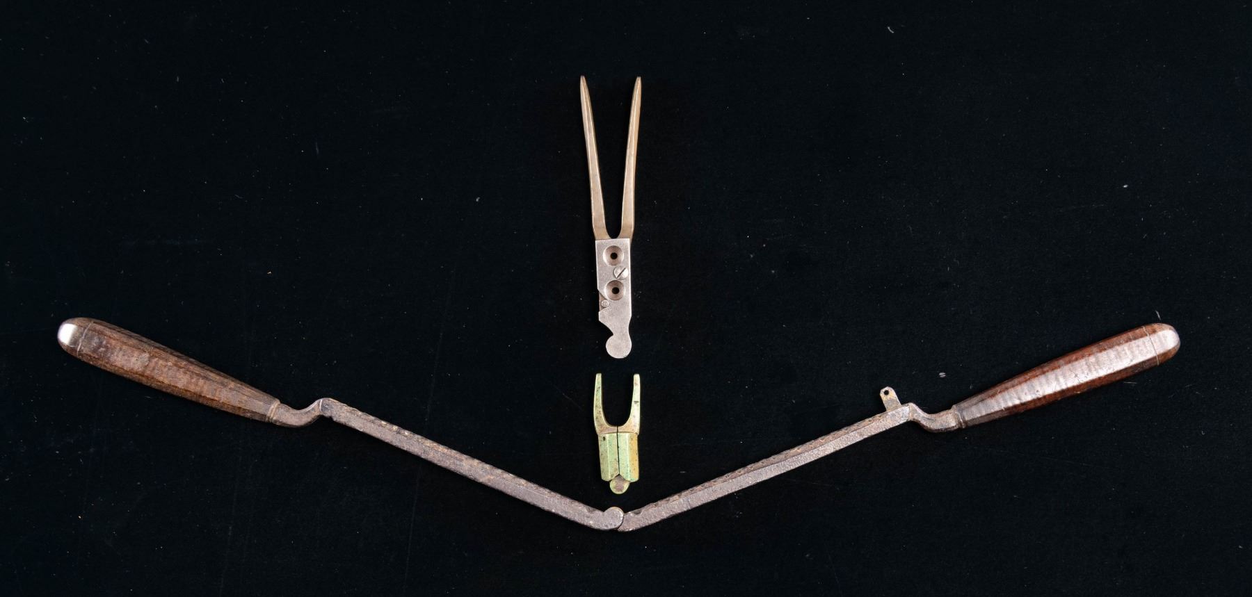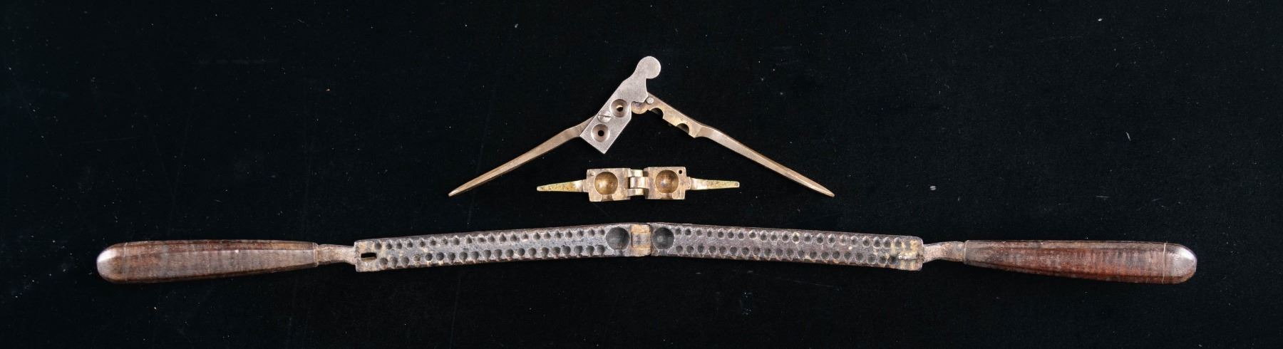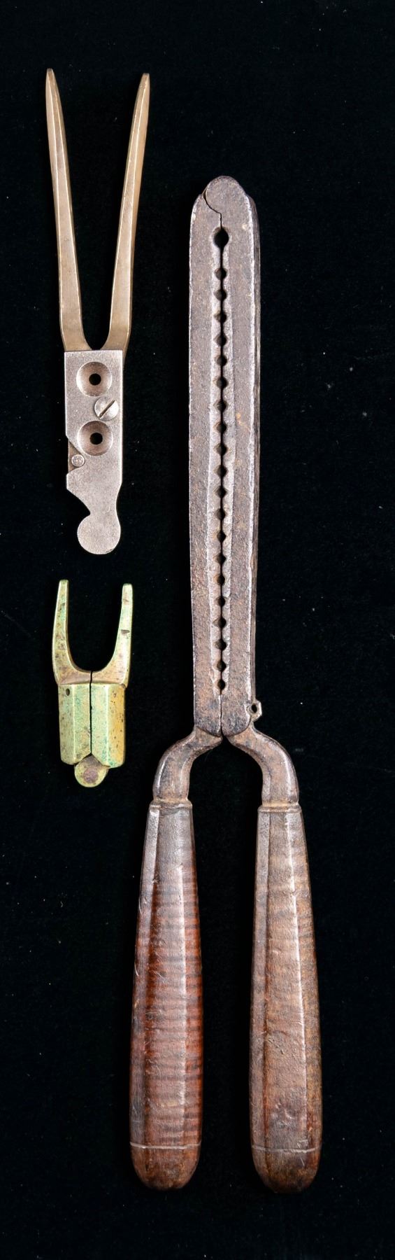 15" 18th century buck & ball mold, molds 1-69cal ball & 40 shot, complete with wood handles. Brass single 69cal ball missing wood handles, nicely patinaed. 2-cavity "LAC" 54bore double cavity brass mold with iron sprue cutter, for Kerr or similar Civil War era large bore revolver. CONDITION: very good overall and as noted. PROVENANCE: Estate Collection of Compton LaBauve Jr. (02-26476-5/JS). NON-GUN. $300-500.