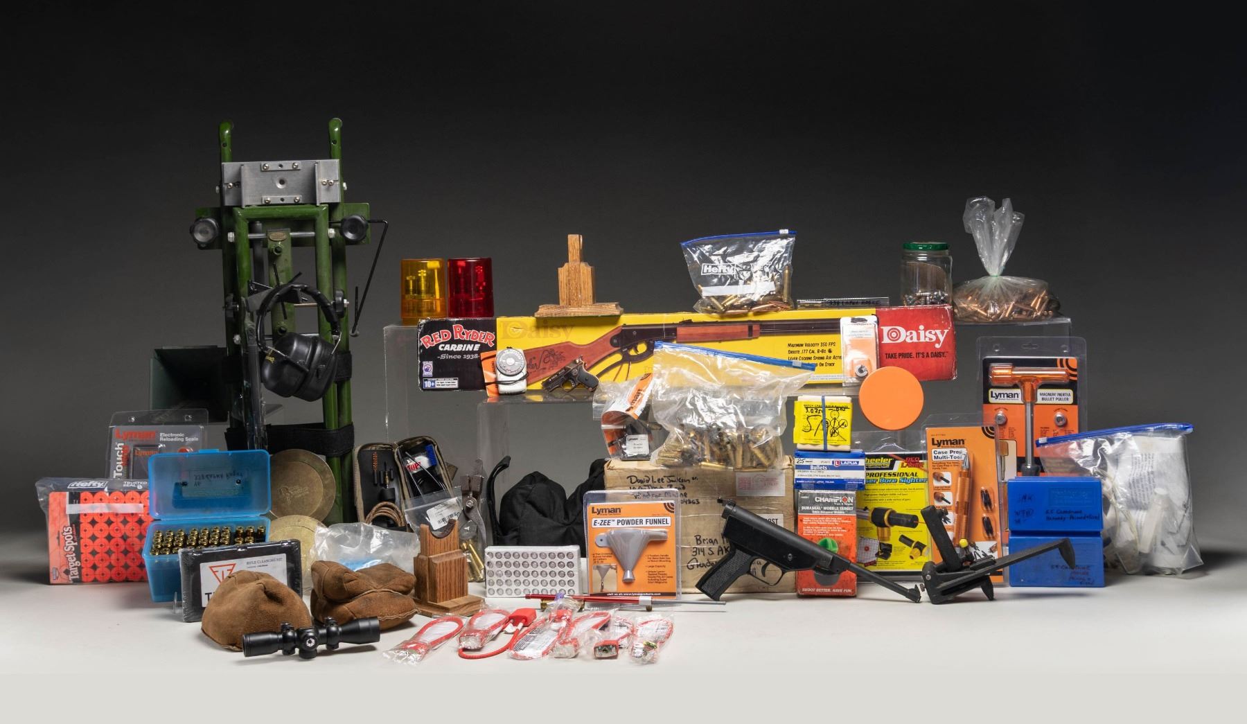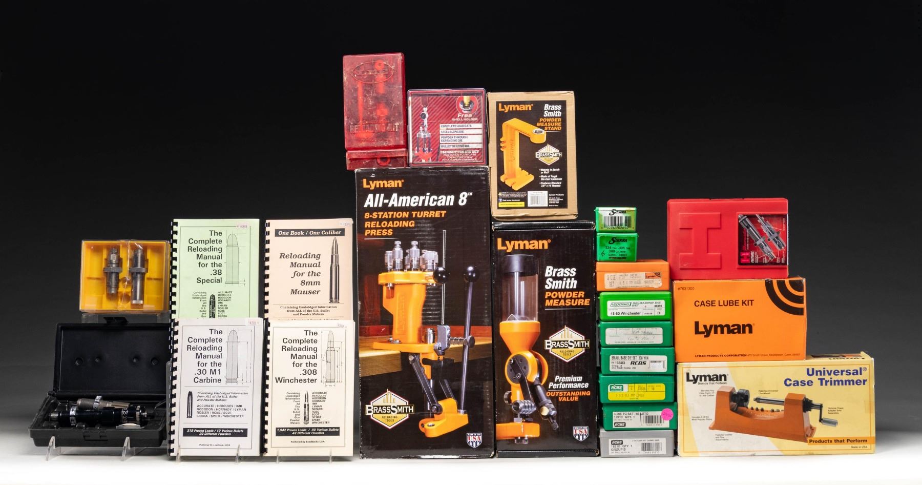 SHOOTER ACCESSORIES. LYMAN BRASS SMITH tools that are all new appearing in original boxes (some still sealed): All American 8 station turret press. / Powder measure. / Powder measure stand. / Case lube kit. / Case trimmer. / Primer flipper. / X-12 shell holder. / Case Prep Multi-Tool. / E-ZEE powder funnel. / Magnum Inertia Bullet Puller. / Pocket-Touch 1500 electronic reloading scale. / Powder Dribbler. / DIE SETS: Whidden Gunworks 338 Lapua Rogue set with micrometer seater ($200+ MSRP). Special long range wildcat cartridge with 37 degree shoulder designed for long range shooting using 300 grain bullets with muzzle velocities of 2900 to 2950 FPS delivering 1/2 MOA accuracy. / Redding 45-60. / Lyman 6.5X55 Sweedish Mauser. / Hornady Titanium Nitride 45 Colt. / Lee 38-55. / Lee 308 collet sizing set. / Lee 223 collet sizing set. / Lee 38 Spl.-357Mag. carbide. / LeeLoader basic 45-70 loader with light oxidation. / LeeLoader basic 45 Colt loader with light oxidation. / RCBS - 9MM Luger with shell holder. / 308 Win. Small Base with shell holder. / 250 Savage with shell holder. / 45 ACP with 2 extra seating stems. / 38 Spl. (and 357 Mag.) carbide. / Box of 40 Sierra 2650 bullets (250 gr. HPBT in .338). / Box of 15 Sierra 9300T bullets (300 gr. HPBT in .338). / 25 Lapua 300 gr. .338 OTM Scenar bullets. / 33 Berger 300 gr. .338 OTM Hybrid bullets. / Approx. 50 gas checked 200 gr. .340 lead bullets. / Approx 100 The Bullet Shop 325 gr. .459 sized and lubed bullets; BHN-9. / 300+ Match BT .338 bullets of unknown make. / 50 Buffalo Arms 325 gr. .458 hand cast lead FN bullets. / 50 Buffalo Arms 45-60 new brass cases made from 45-70 brass. / Winchester 45-60 single cavity mold cleaned of oxidation plus replacement pivot. / 50+ rds. 7.62X54R fired brass cases. / (approx. 15) 338 Win. Mag. fired cases and match BT bullets of unknown weight and brand. / 46 prepped 338 Lapua Rogue cases in plastic box. / 50 Nosler prepped and primed 6.5 Creedmoor cases in plastic box. / 50 Hornady prepped and primed 6.5 Creedmoor cases in plastic box. / Green toned nylon zippered field cleaning kit. / TIKKA (Beretta) 243-6mm cleaning kit (new, unopened).\ Wheeler Engineering Professional red laser bore sighter; new in package. / Small metal pellet trap and specific sized compatible targets. / Champion Duraseal Wobble Target appearing new in box. / Browning PM3010 ear muffs plus pack of Browning foam plugs. / 6 cable style gun padlocks. / Bower TK-79 Camera Light Meter with instructions. / Dillon Precision Nato Spec. brass primer flipper. / Hornady Lock-N-Load OAL gauge with 338 Lapua plus 338 Lapua Rogue fitted cases. / Double brown leather shooting bag set. / Black nylon bunny ear bag. / 2 finely cragted oak rifle supports with green felt bottoms. / Hold-up-Display handgun stand. / 338 Lapua Magnum Rogue finish reamer. / Clymer "BR" "GO" headspace gauge for Remington BR calibers; 1.167". / Unmarked base for handgun bench support; missing cradle section. / Hyskore Dual Damper Precision Machine Rest with hydraulic trigger pull mechanism and special machinist made forend support. / Barska 4X32 rifle scope with duplex reticle plus alloy scope rings for Weaver style bases. / Unmarked (likely Chinese) .177 pellet pistol with black plastic frame, break action cocking and adjustable rear sight (missing 1 adjustment screw plus 1 frame retention screw. / New, sealed in box Daisy Red Ryder BB Gun. / Copper toned small semi-auto pistol that is actually a cigarette lighter appearing to be Butane powered. / Antique 12 Ga. shotgun reloading hand tool set with brass shotshell marked "FOWLER" and "No. 12". / Two, 3 section wooden shotgun cleaning rods. / Specific loading manuals for: 38 Spl., 8MM Mauser, .308 Win., and .30 Carb. (02-25809/NW). $750-1,000.