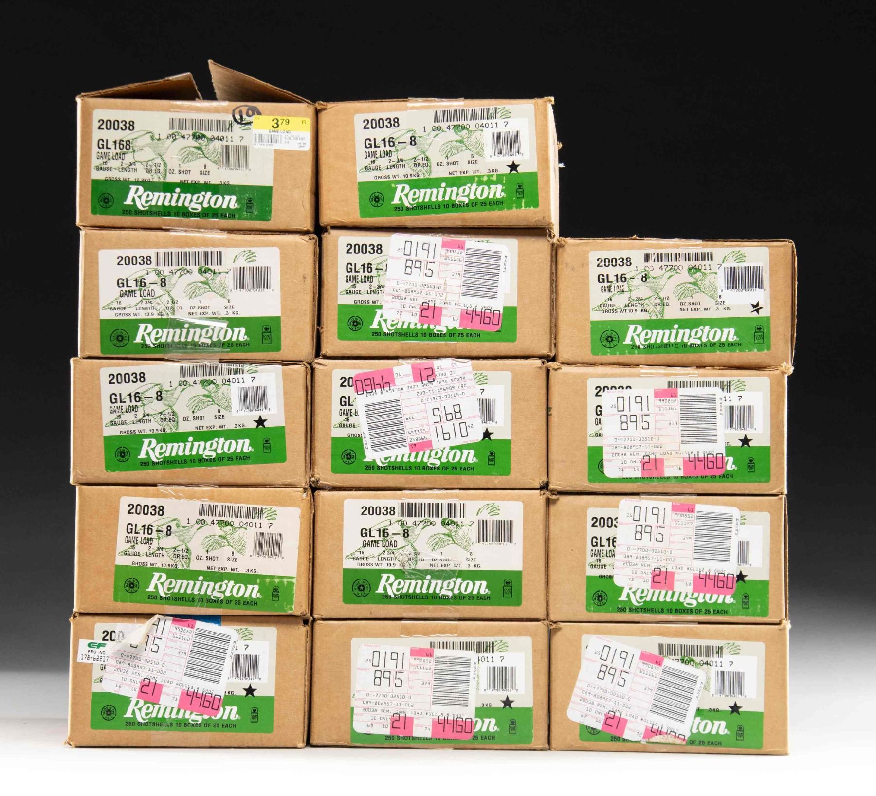 14 sealed cases (3,500 rounds) of Remington 16 gauge with "20038" stock number. Case lengths of 2 3/4", 2 1/2 Dram equivalence plus 1 oz. of #8 shot. PROVENANCE: Estate of Lloyd Robinson. (02-26049-4/NW). $800-1,200.