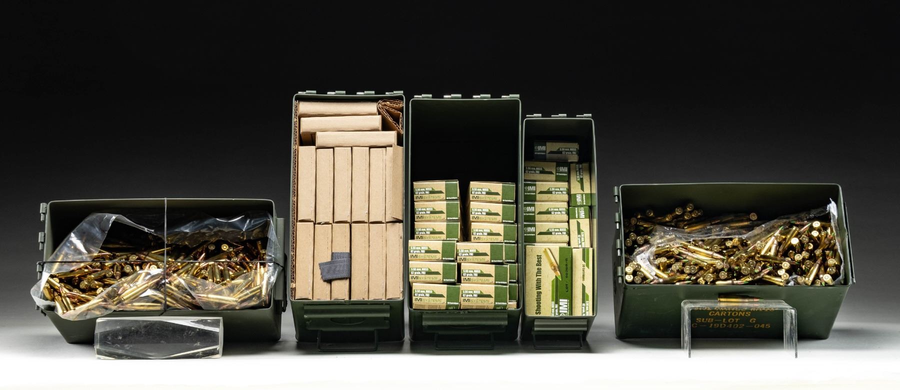 All near excellent and late production. Packed in steel GI style ammo cans; 4 of 50 cal. and 1 of 30 cal. Amounts based upon printed amounts on cans for bulk ammo. All FMJ unless noted. 1). 840 rounds bulk of green tip 5.56 with "LC 21" headstamps; 62 grain M855 variant. 2). 840 rounds bulk of 223 Remington with "FC 223 REM" headstamps. 3). 820 rounds of 5.56 in 20 round boxes having "LC19" headstamps. 4). 34 boxes (30 rounds each) of 5.56 by IMI; M855 with 62 grain bullets. Packed in 30 and 50 cal. cans. (02-25177-13/NW). AMMO. $800-1,200.